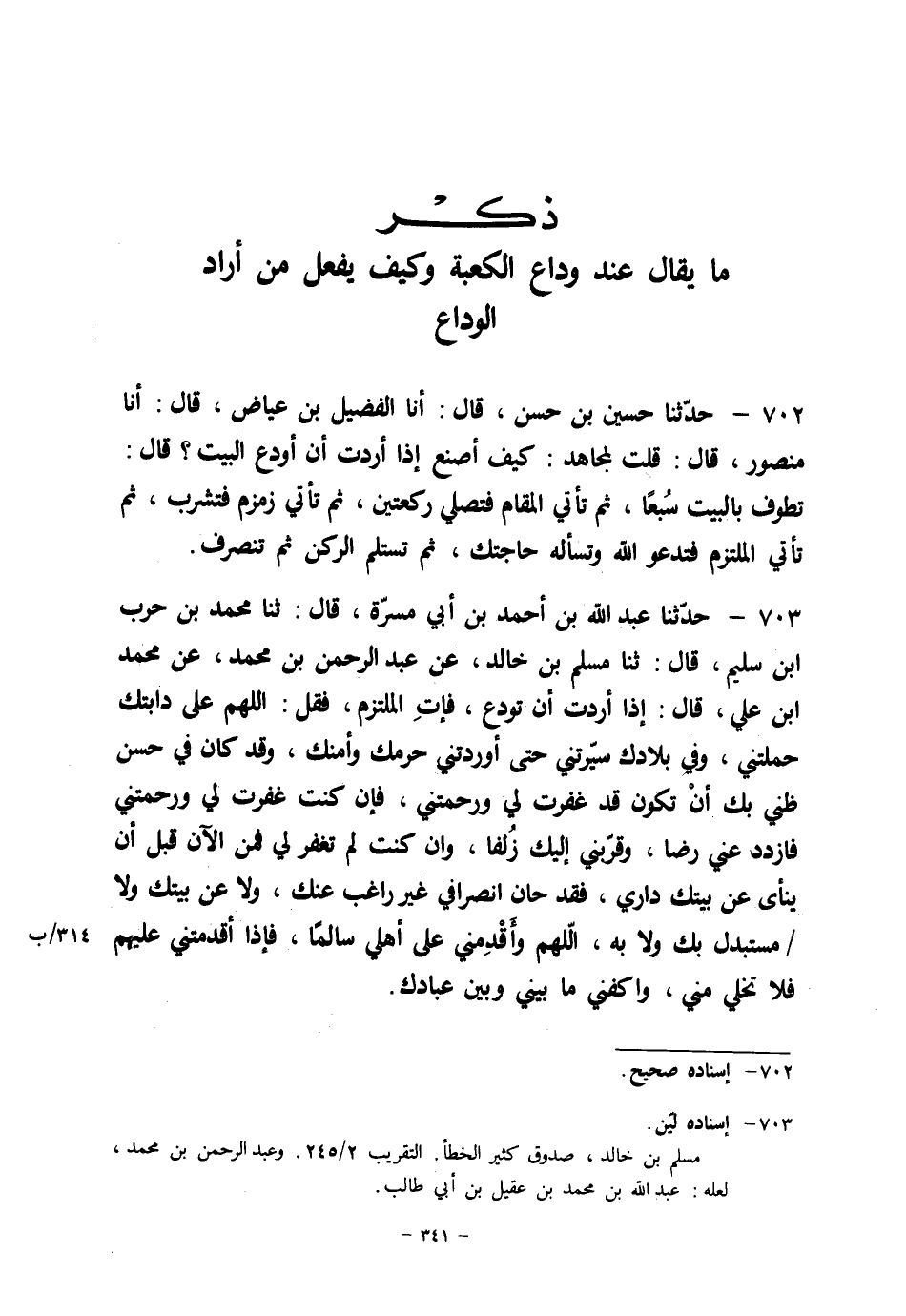 702 - حَدَّثَنَا حُسَيْنُ بْنُ حَسَنٍ قَالَ: أنا الْفُضَيْلُ بْنُ عِيَاضٍ قَالَ: أنا مَنْصُورٌ قَالَ: قُلْتُ لِمُجَاهِدٍ: §كَيْفَ أَصْنَعُ إِذَا أَرَدْتُ أَنْ أُوَدِّعَ الْبَيْتَ؟ قَالَ: " تَطُوفُ بِالْبَيْتِ سَبْعًا، ثُمَّ تَأْتِي الْمَقَامَ فَتُصَلِّي رَكْعَتَيْنِ، ثُمَّ تَأْتِي زَمْزَمَ فَتَشْرَبُ، ثُمَّ تَأْتِي الْمُلْتَزَمَ فَتَدْعُو اللهَ وَتَسْأَلُهُ حَاجَتَكَ، ثُمَّ تَسْتَلِمُ الرُّكْنَ ثُمَّ تَنْصَرِفُ "