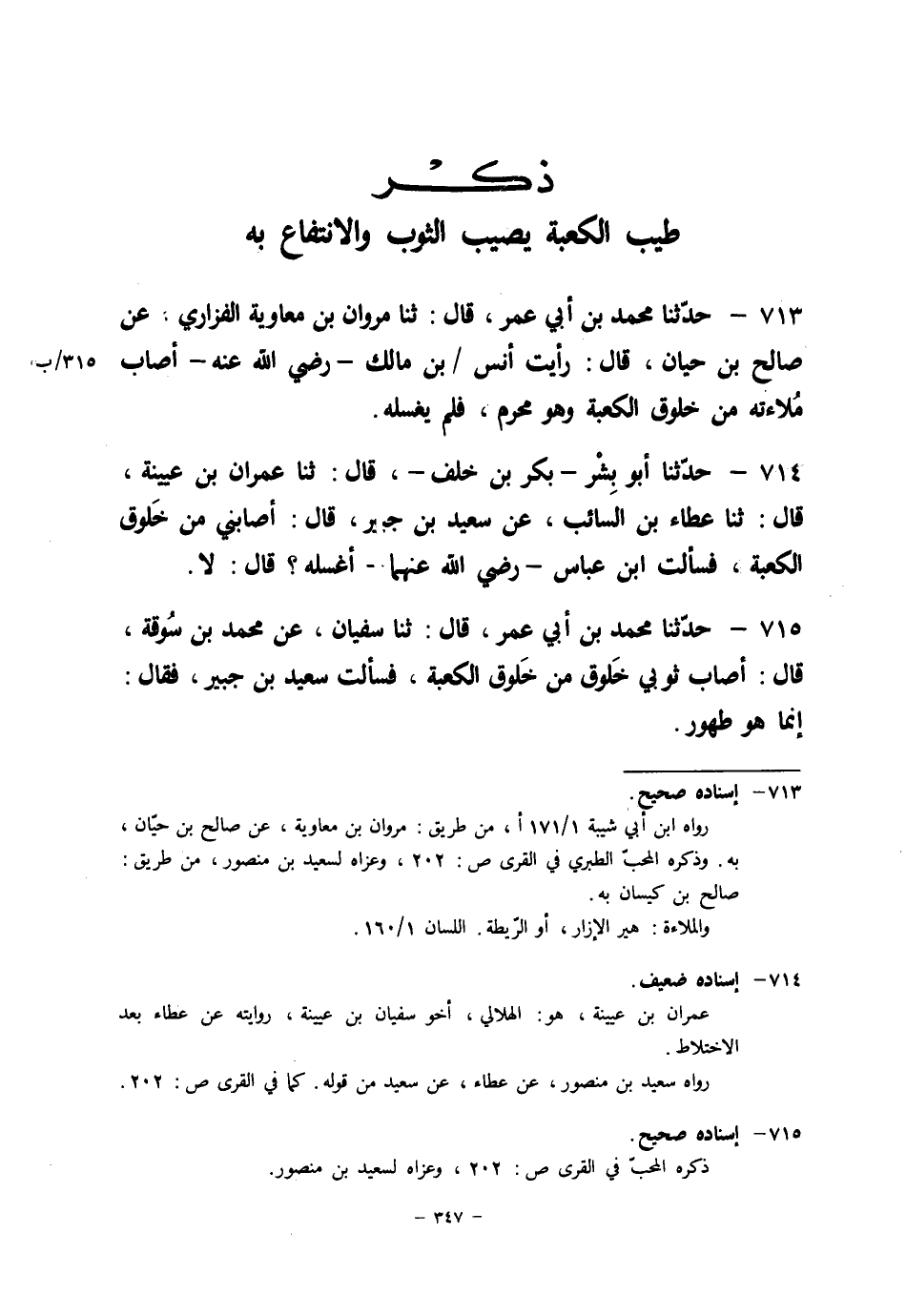 715 - حَدَّثَنَا مُحَمَّدُ بْنُ أَبِي عُمَرَ قَالَ: ثنا سُفْيَانُ، عَنْ مُحَمَّدِ بْنِ سُوقَةَ قَالَ: §أَصَابَ ثَوْبِي خَلُوقٌ مِنْ خَلُوقِ الْكَعْبَةِ، فَسَأَلْتُ سَعِيدَ بْنَ جُبَيْرٍ، فَقَالَ: " إِنَّمَا هُوَ طَهُورٌ "