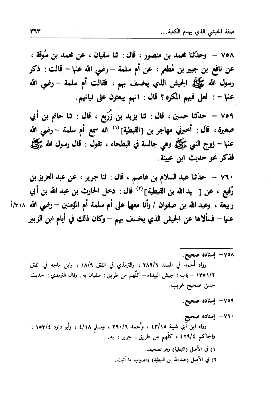 761 - حَدَّثَنَا أَبُو بِشْرٍ بَكْرُ بْنُ خَلَفٍ قَالَ: ثنا عَبْدُ الرَّحْمَنِ بْنُ مَهْدِيٍّ، عَنْ سُفْيَانَ، عَنْ سَلَمَةَ يَعْنِي ابْنَ كُهَيْلٍ، عَنْ أَبِي إِدْرِيسَ، عَنِ ابْنِ صَفْوَانَ يَعْنِي مُسْلِمًا، عَنْ صَفِيَّةَ بِنْتِ حُيَيٍّ رَضِيَ اللهُ عَنْهَا، عَنِ النَّبِيِّ صَلَّى اللَّهُ عَلَيْهِ وَسَلَّمَ قَالَ: " §لَا يَنْتَهِي النَّاسُ عَنْ غَزْوِ هَذَا الْبَيْتِ حَتَّى إِذَا كَانُوا بِبَيْدَاءَ مِنَ الْأَرْضِ خُسِفَ بِأَوَّلِهِمْ وَآخِرِهِمْ، وَلَمْ يَنْجُ وَسَطُهُمْ " قَالَ: قُلْتُ: إِنَّ فِيهِمُ الْمُكْرَهَ؟ قَالَ: " يَبْعَثُهُمُ اللهُ تَعَالَى عَلَى مَا فِي أَنْفُسِهِمْ "