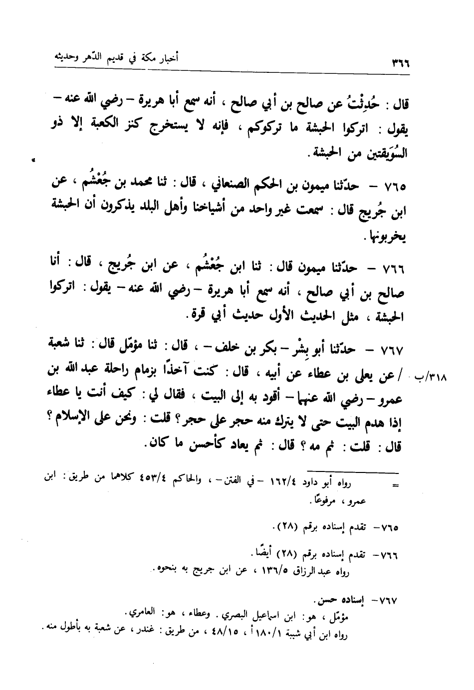 767 - حَدَّثَنَا أَبُو بِشْرٍ بَكْرُ بْنُ خَلَفٍ قَالَ: ثنا مُؤَمَّلٌ قَالَ: ثنا شُعْبَةُ، عَنْ يَعْلَى بْنِ عَطَاءٍ، عَنْ أَبِيهِ قَالَ: كُنْتُ آخِذًا بِزِمَامِ رَاحِلَةِ عَبْدِ اللهِ بْنِ عَمْرٍو رَضِيَ اللهُ عَنْهُمَا أَقُودُ بِهِ إِلَى الْبَيْتِ، فَقَالَ لِي: " كَيْفَ أَنْتَ يَا عَطَاءُ §إِذَا هُدِمَ الْبَيْتُ حَتَّى لَا يُتْرَكَ مِنْهُ حَجَرٌ عَلَى حَجَرٍ؟ " قُلْتُ: وَنَحْنُ عَلَى الْإِسْلَامِ؟ قَالَ: قُلْتُ: ثُمَّ مَهْ؟ قَالَ: " ثُمَّ يُعَادُ كَأَحْسَنِ مَا كَانَ "