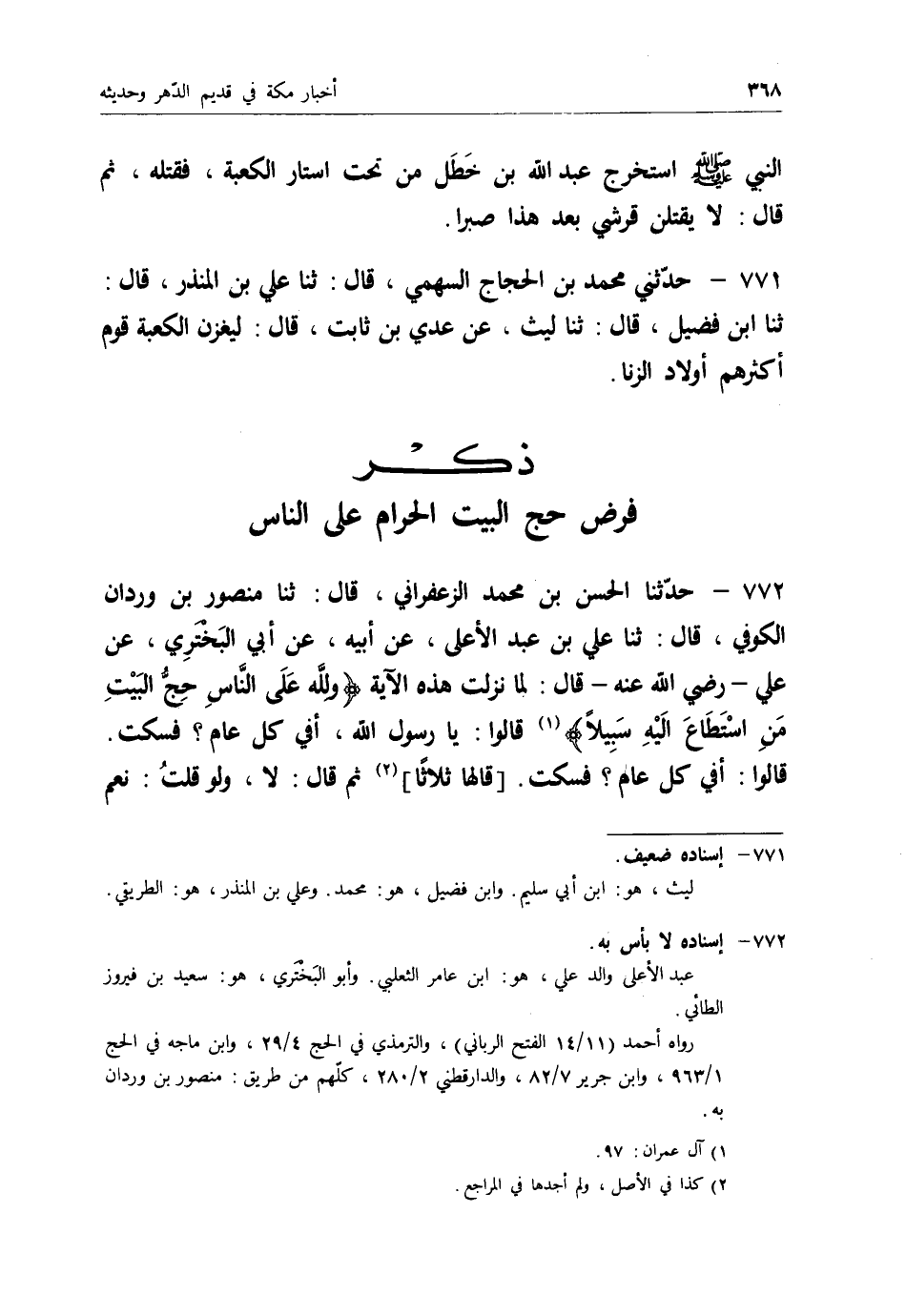 772 - حَدَّثَنَا الْحَسَنُ بْنُ مُحَمَّدٍ الزَّعْفَرَانِيُّ قَالَ: ثنا مَنْصُورُ بْنُ وَرْدَانَ الْكُوفِيُّ قَالَ: ثنا عَلِيُّ بْنُ عَبْدِ الْأَعْلَى، عَنْ أَبِيهِ، عَنْ أَبِي الْبَخْتَرِيِّ، عَنْ عَلِيٍّ رَضِيَ اللهُ عَنْهُ قَالَ: لَمَّا نَزَلَتْ هَذِهِ الْآيَةُ: {وَلِلَّهِ عَلَى النَّاسِ حِجُّ الْبَيْتِ مَنِ اسْتَطَاعَ إِلَيْهِ سَبِيلًا} [آل عمران: 97] قَالُوا: يَا رَسُولَ اللهِ أَفِي كُلِّ عَامٍ؟ فَسَكَتَ، قَالُوا: أَفِي كُلِّ عَامٍ؟ فَسَكَتَ، قَالَهَا ثَلَاثًا، ثُمَّ قَالَ: " §لَا، وَلَوْ قُلْتُ: -[369]- نَعَمْ، لَوَجَبَتْ " فَأَنْزَلَ اللهُ تَعَالَى هَذِهِ الْآيَةَ: {يَا أَيُّهَا الَّذِينَ آمَنُوا لَا تَسْأَلُوا عَنْ أَشْيَاءَ إِنْ تُبْدَ لَكُمْ تَسُؤْكُمْ} [المائدة: 101] "