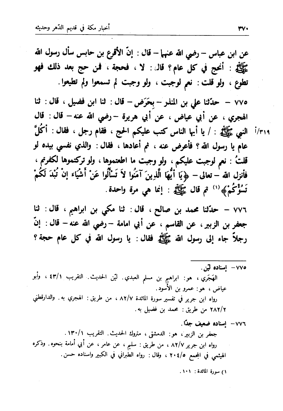 776 - حَدَّثَنَا مُحَمَّدُ بْنُ صَالِحٍ قَالَ: ثنا مَكِّيُّ بْنُ إِبْرَاهِيمَ قَالَ: ثنا جَعْفَرُ بْنُ الزُّبَيْرِ، عَنِ الْقَاسِمِ، عَنْ أَبِي أُمَامَةَ رَضِيَ اللهُ عَنْهُ قَالَ: إِنَّ رَجُلًا جَاءَ إِلَى رَسُولِ اللهِ صَلَّى اللَّهُ عَلَيْهِ وَسَلَّمَ فَقَالَ: يَا رَسُولَ اللهِ §فِي كُلِّ عَامٍ -[371]- حِجَّةٌ؟ فَسَكَتَ، ثُمَّ أَعَادَ الثَّانِيَةَ، ثُمَّ أَعَادَ الثَّالِثَةَ، فَقَالَ نَبِيُّ اللهِ صَلَّى اللَّهُ عَلَيْهِ وَسَلَّمَ: " لَوْ قُلْتُ نَعَمْ لَوَجَبَتْ، وَلَكَفَرْتُمْ، وَمَا اسْتَطَعْتُمْ "