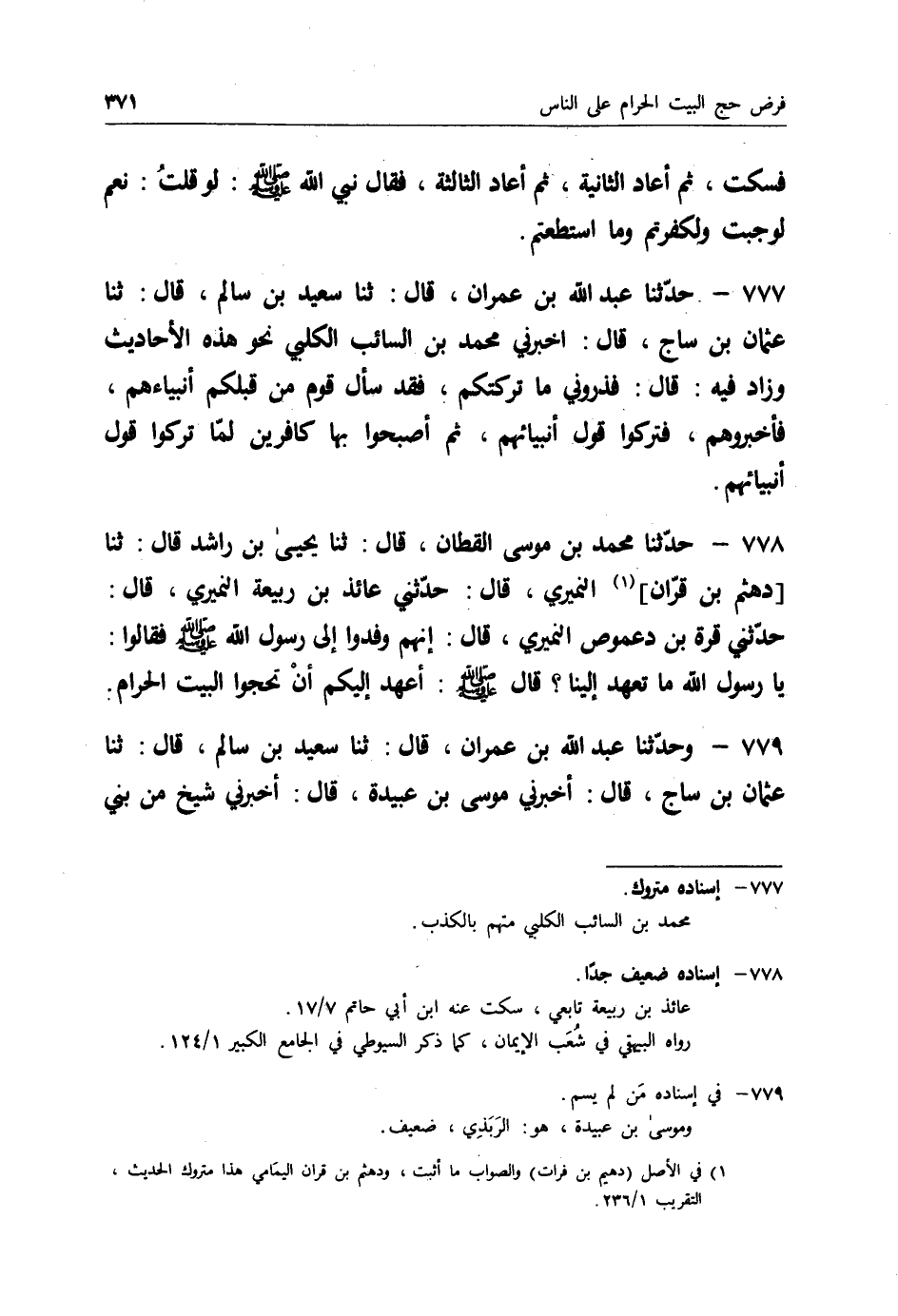778 - حَدَّثَنَا مُحَمَّدُ بْنُ مُوسَى الْقَطَّانُ قَالَ: ثنا يَحْيَى بْنُ رَاشِدٍ قَالَ: ثنا دَهْثَمُ بْنُ قُرَّانَ النُّمَيْرِيُّ قَالَ: حَدَّثَنِي عَائِذُ بْنُ رَبِيعَةَ النُّمَيْرِيُّ قَالَ: حَدَّثَنِي قُرَّةُ بْنُ دَعْمُوصٍ النُّمَيْرِيُّ قَالَ: إِنَّهُمْ وَفَدُوا إِلَى رَسُولِ اللهِ صَلَّى اللَّهُ عَلَيْهِ وَسَلَّمَ فَقَالُوا: يَا رَسُولَ اللهِ مَا تَعْهَدُ إِلَيْنَا؟ قَالَ صَلَّى اللَّهُ عَلَيْهِ وَسَلَّمَ: " §أَعْهَدُ إِلَيْكُمْ أَنْ تَحُجُّوا الْبَيْتَ الْحَرَامَ "