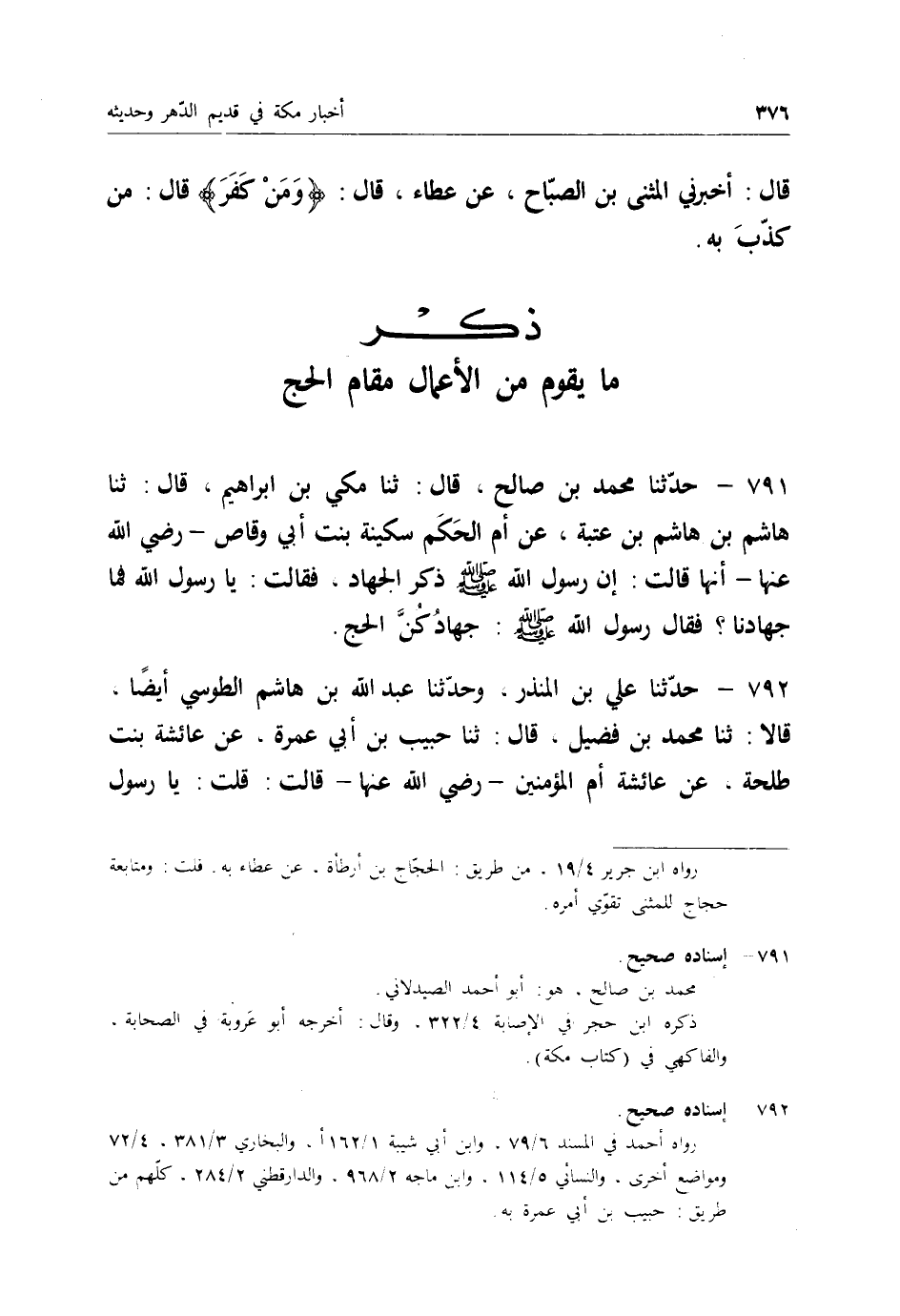 791 - حَدَّثَنَا مُحَمَّدُ بْنُ صَالِحٍ قَالَ: ثنا مَكِّيُّ بْنُ إِبْرَاهِيمَ قَالَ: ثنا هَاشِمُ بْنُ هَاشِمِ بْنِ عُتْبَةَ، عَنْ أُمِّ الْحَكَمِ سَكِينَةَ بِنْتِ أَبِي وَقَّاصٍ رَضِيَ اللهُ عَنْهَا أَنَّهَا قَالَتْ: إِنَّ رَسُولَ اللهِ صَلَّى اللَّهُ عَلَيْهِ وَسَلَّمَ ذَكَرَ الْجِهَادَ، فَقَالَتْ: يَا رَسُولَ اللهِ، فَمَا جِهَادُنَا؟ فَقَالَ رَسُولُ اللهِ صَلَّى اللَّهُ عَلَيْهِ وَسَلَّمَ: " §جِهَادُكُنَّ الْحَجُّ "