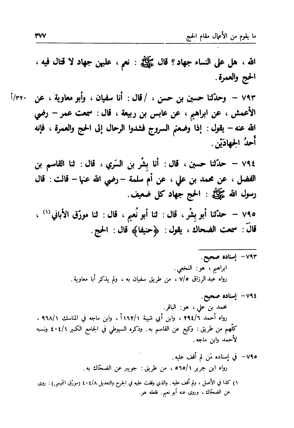 794 - حَدَّثَنَا حُسَيْنٌ قَالَ: أنا بِشْرُ بْنُ السَّرِيِّ قَالَ: ثنا الْقَاسِمُ بْنُ الْفَضْلِ، عَنْ مُحَمَّدِ بْنِ عَلِيٍّ، عَنْ أُمِّ سَلَمَةَ رَضِيَ اللهُ عَنْهَا قَالَتْ: قَالَ رَسُولُ اللهِ صَلَّى اللَّهُ عَلَيْهِ وَسَلَّمَ: " §الْحَجُّ جِهَادُ كُلِّ ضَعِيفٍ "