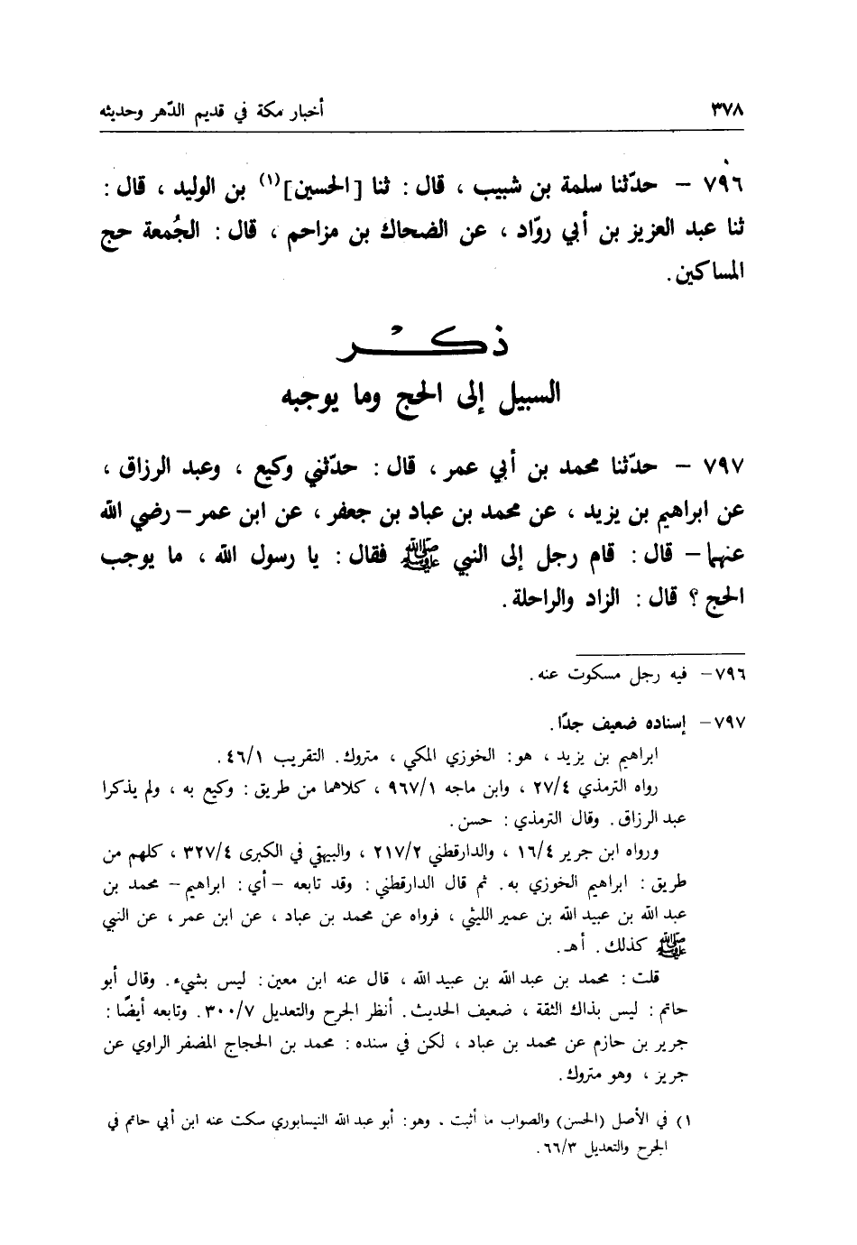 798 - وَحَدَّثَنَا عَبْدُ اللهِ بْنُ عِمْرَانَ قَالَ: أنا سَعِيدُ بْنُ سَالِمٍ قَالَ: قَالَ عُثْمَانُ: أَخْبَرَنِي عَبَّادُ بْنُ كَثِيرٍ، عَنْ لَيْثٍ، عَنِ ابْنِ سَابِطٍ قَالَ: قَالَ رَجُلٌ: يَا رَسُولَ اللهِ أَرَأَيْتَ قَوْلَ اللهِ تَبَارَكَ وَتَعَالَى: {§وَلِلَّهِ عَلَى النَّاسِ حِجُّ الْبَيْتِ مَنِ اسْتَطَاعَ إِلَيْهِ سَبِيلًا} [آل عمران: 97] مَا السَّبِيلُ يَا رَسُولَ اللهِ الَّذِي قَالَ اللهُ تَعَالَى؟ قَالَ: " مِنَ الرِّجَالِ زَادٌ وَرَاحِلَةٌ، وَمِنَ النِّسَاءِ زَادٌ وَرَاحِلَةٌ وَمَحْرَمٌ "
