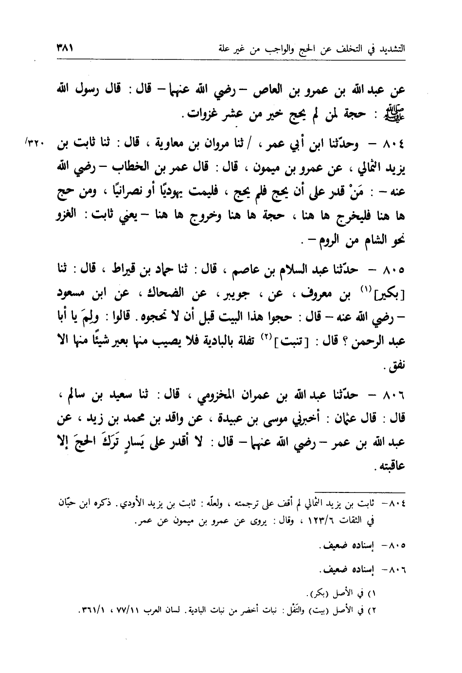 806 - حَدَّثَنَا عَبْدُ اللهِ بْنُ عِمْرَانَ الْمَخْزُومِيُّ قَالَ: ثنا سَعِيدُ بْنُ سَالِمٍ قَالَ: قَالَ عُثْمَانُ: أَخْبَرَنِي مُوسَى بْنُ عُبَيْدَةَ، عَنْ وَاقِدِ بْنِ مُحَمَّدِ بْنِ زَيْدٍ، عَنْ عَبْدِ اللهِ بْنِ عُمَرَ رَضِيَ اللهُ عَنْهُمَا قَالَ: " §لَا أَقْدِرُ عَلَى يَسَارٍ تَرَكَ الْحَجَّ إِلَّا عَاقَبْتُهُ "