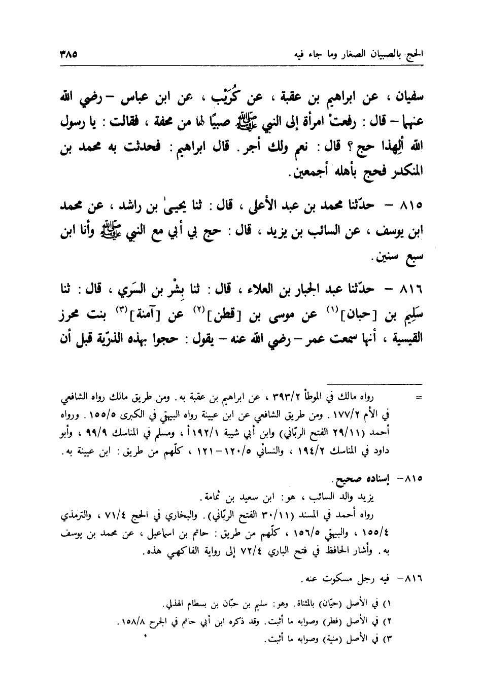 817 - حَدَّثَنَا ابْنُ أَبِي عُمَرَ، وَعَبْدُ الْجَبَّارِ، قَالَا: ثنا سُفْيَانُ قَالَ: أَخْبَرَنِي الْمُنْكَدِرُ بْنُ مُحَمَّدِ بْنِ الْمُنْكَدِرِ، عَنْ أَبِيهِ، أَنَّهُ قِيلَ لَهُ: §الْحَجُّ بِالصِّبْيَانِ؟ قَالَ: " نَعَمْ اعْرِضْهُمْ لِلَّهِ عَزَّ وَجَلَّ "