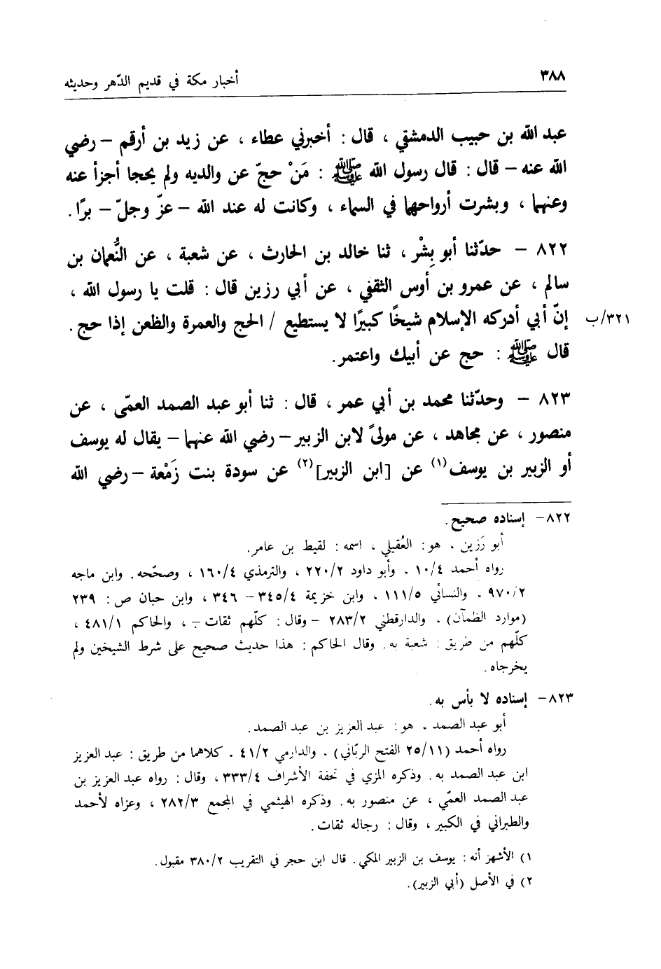 823 - وَحَدَّثَنَا مُحَمَّدُ بْنُ أَبِي عُمَرَ قَالَ: ثنا أَبُو عَبْدِ الصَّمَدِ الْعَمِّيُّ، عَنْ مَنْصُورٍ، عَنْ مُجَاهِدٍ، عَنْ مَوْلًى لِابْنِ الزُّبَيْرِ رَضِيَ اللهُ عَنْهُمَا يُقَالُ لَهُ: يُوسُفُ أَوْ الزُّبَيْرُ بْنُ يُوسُفَ، عَنِ ابْنِ الزُّبَيْرِ، عَنْ سَوْدَةَ بِنْتِ زَمْعَةَ رَضِيَ -[389]- اللهُ عَنْهَا قَالَتْ: جَاءَ رَجُلٌ إِلَى النَّبِيِّ صَلَّى اللَّهُ عَلَيْهِ وَسَلَّمَ فَقَالَ: إِنَّ أَبِي شَيْخٌ كَبِيرٌ لَا يَسْتَطِيعُ أَنْ يَحُجَّ. قَالَ صَلَّى اللَّهُ عَلَيْهِ وَسَلَّمَ: " أَرَأَيْتَكَ لَوْ كَانَ عَلَى أَبِيكَ دَيْنٌ فَقَضَيْتَهُ عَنْهُ، يُقْبَلُ مِنْكَ؟ " قَالَ: نَعَمْ. قَالَ صَلَّى اللَّهُ عَلَيْهِ وَسَلَّمَ: " فَاللهُ تَبَارَكَ وَتَعَالَى أَرْحَمُ، §حُجَّ عَنْ أَبِيكَ "