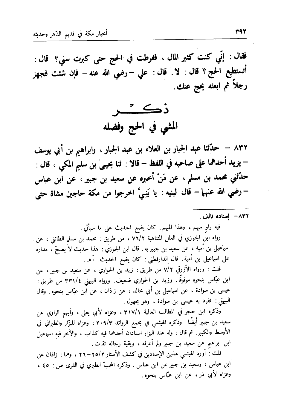 832 - حَدَّثَنَا عَبْدُ الْجَبَّارِ بْنُ الْعَلَاءِ بْنِ عَبْدِ الْجَبَّارِ، وَإِبْرَاهِيمُ بْنُ أَبِي يُوسُفَ، يَزِيدُ أَحَدُهُمَا عَلَى صَاحِبِهِ فِي اللَّفْظِ قَالَا: ثنا يَحْيَى بْنُ سُلَيْمٍ الْمَكِّيُّ قَالَ: حَدَّثَنِي مُحَمَّدُ بْنُ مُسْلِمٍ، عَنْ مَنْ أَخْبَرَهُ، عَنْ سَعِيدِ بْنِ جُبَيْرٍ، عَنِ ابْنِ عَبَّاسٍ رَضِيَ اللهُ عَنْهُمَا قَالَ لِبَنِيهِ: " يَا بَنِيَّ اخْرُجُوا مِنْ مَكَّةَ حَاجِّينَ مُشَاةً -[393]- حَتَّى تَرْجِعُوا إِلَى مَكَّةَ مُشَاةً، فَإِنِّي سَمِعْتُ رَسُولَ اللهِ صَلَّى اللَّهُ عَلَيْهِ وَسَلَّمَ يَقُولُ: " إِنَّ §لِلْحَاجِّ الرَّاكِبِ بِكُلِّ خُطْوَةٍ تَخْطُوهَا رَاحِلَتُهُ سَبْعِينَ حَسَنَةً " وَقَالَ ابْنُ أَبِي يُوسُفَ: " ثَمَانِينَ حَسَنَةً " " وَلِلْمَاشِي بِكُلِّ خُطْوَةٍ سَبْعَمِائَةِ حَسَنَةٍ مِنْ حَسَنَاتِ الْحَرَمِ " قِيلَ: يَا رَسُولَ اللهِ، وَمَا حَسَنَاتُ الْحَرَمِ؟ قَالَ عَبْدُ الْجَبَّارِ فِي حَدِيثِهِ: قَالَ: " الْحَسَنَةُ بِمِائَةِ أَلْفِ حَسَنَةٍ "