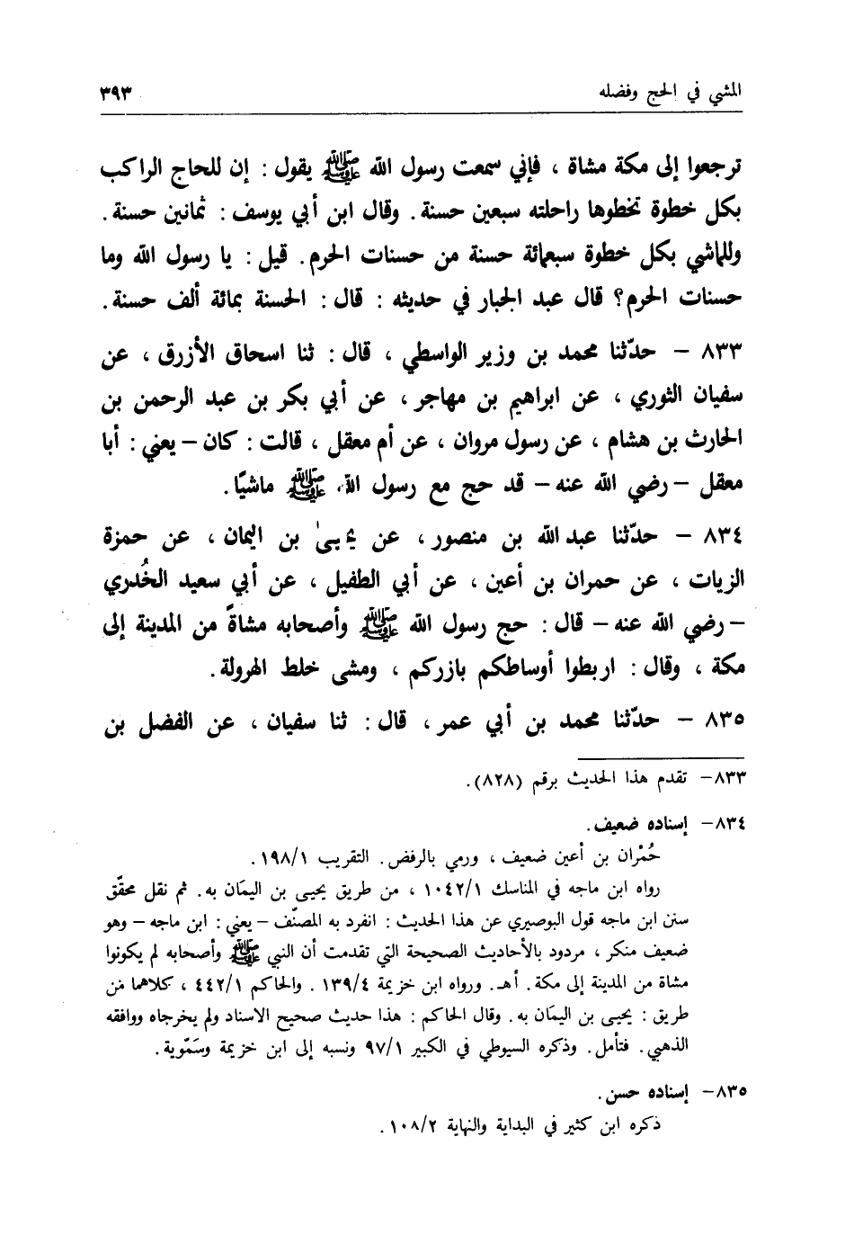 834 - حَدَّثَنَا عَبْدُ اللهِ بْنُ مَنْصُورٍ، عَنْ يَحْيَى بْنِ الْيَمَانِ، عَنْ حَمْزَةَ الزَّيَّاتِ، عَنْ حُمْرَانَ بْنِ أَعْيَنَ، عَنْ أَبِي الطُّفَيْلِ، عَنْ أَبِي سَعِيدٍ الْخُدْرِيِّ رَضِيَ اللهُ عَنْهُ قَالَ: حَجَّ رَسُولُ اللهِ صَلَّى اللَّهُ عَلَيْهِ وَسَلَّمَ وَأَصْحَابُهُ مُشَاةً مِنْ الْمَدِينَةِ إِلَى مَكَّةَ، وَقَالَ: " §ارْبِطُوا أَوْسَاطَكُمْ بِأُزُرِكُمْ "، وَمَشَى خِلْطَ الْهَرْوَلَةِ