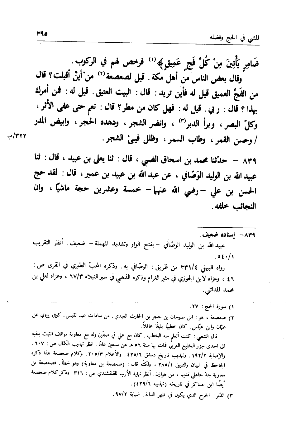 840 - حَدَّثَنَا مُحَمَّدُ بْنُ أَبِي عُمَرَ قَالَ: ثنا سُفْيَانُ قَالَ: ثنا عُبَيْدُ اللهِ بْنُ الْوَلِيدِ، عَنْ عَبْدِ اللهِ بْنِ عُبَيْدِ بْنِ عُمَيْرٍ قَالَ: قَالَ ابْنُ عَبَّاسٍ رَضِيَ اللهُ عَنْهُمَا: " §مَا آسَى عَلَى شَيْءٍ إِلَّا أَنِّي لَمْ أَحُجَّ مَاشِيًا، إِنِّي سَمِعْتُ رَسُولَ اللهِ صَلَّى اللَّهُ عَلَيْهِ وَسَلَّمَ يَقُولُ: " {يَأْتُوكَ رِجَالًا وَعَلَى كُلِّ ضَامِرٍ} [الحج: 27] فَأُرَاهُ بَدَأَ بِهِمْ "