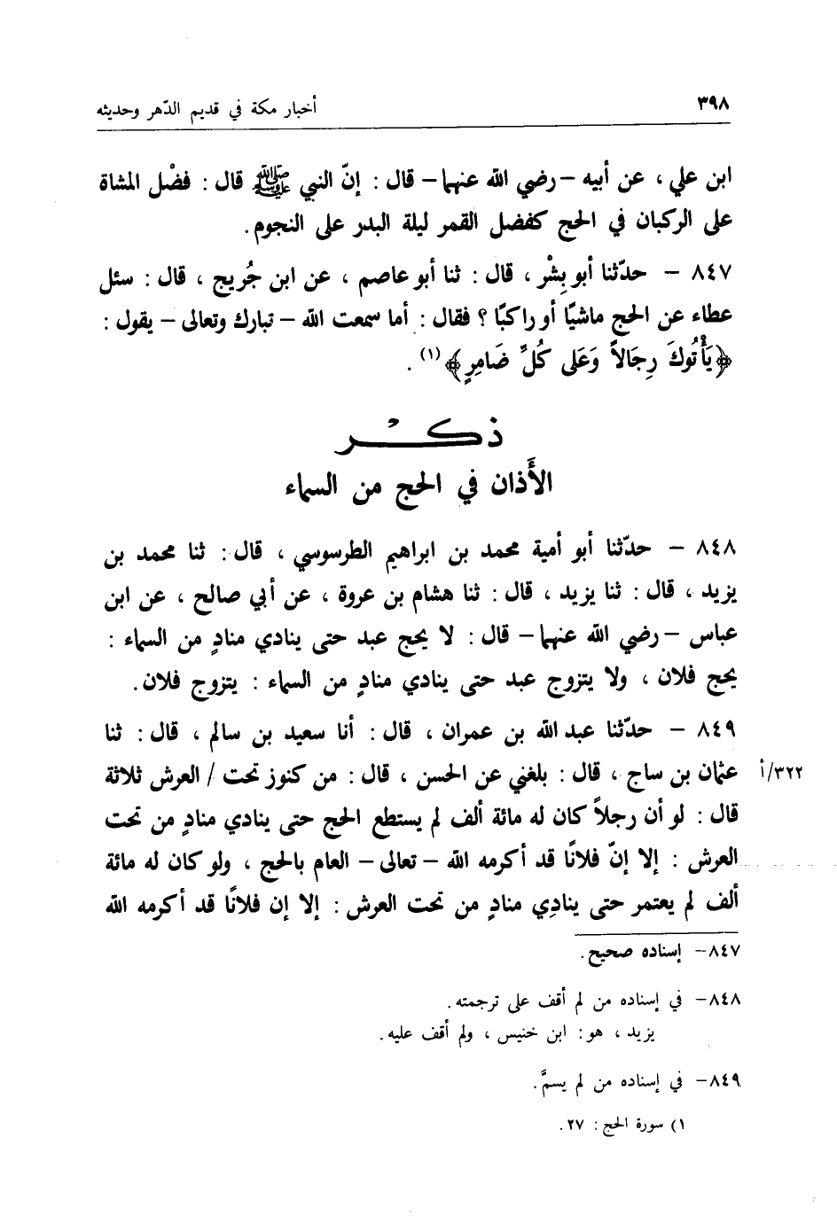 849 - حَدَّثَنَا عَبْدُ اللهِ بْنُ عِمْرَانَ قَالَ: أنا سَعِيدُ بْنُ سَالِمٍ قَالَ: ثنا عُثْمَانُ بْنُ سَاجٍ قَالَ: بَلَغَنِي عَنِ الْحَسَنِ قَالَ: " §مِنْ كُنُوزٍ تَحْتَ الْعَرْشِ ثَلَاثَةٍ قَالَ: لَوْ أَنَّ رَجُلًا كَانَ لَهُ مِائَةُ أَلْفٍ لَمْ يَسْتَطِعِ الْحَجَّ حَتَّى يُنَادِيَ مُنَادٍ مِنْ تَحْتِ الْعَرْشِ: أَلَا إِنَّ فُلَانًا قَدْ أَكْرَمَهُ اللهُ تَعَالَى الْعَامَ بِالْحَجِّ، وَلَوْ كَانَ لَهُ مِائَةُ أَلْفٍ لَمْ يَعْتَمِرْ حَتَّى يُنَادِيَ مُنَادٍ مِنْ تَحْتِ الْعَرْشِ: أَلَا إِنَّ فُلَانًا قَدْ أَكْرَمَهُ -[399]- اللهُ عَزَّ وَجَلَّ بِالْعُمْرَةِ، وَلَوْ أَنَّ رَجُلًا ضَرَبَهُ الْمُشْرِكُونَ بِمِائَةِ أَلْفِ سَيْفٍ لَمْ يَقْتُلْ حَتَّى يُنَادِيَ مُنَادٍ مِنْ تَحْتِ الْعَرْشِ: إِنَّ فُلَانًا قَدْ أَكْرَمَهُ اللهُ بِالشَّهَادَةِ "