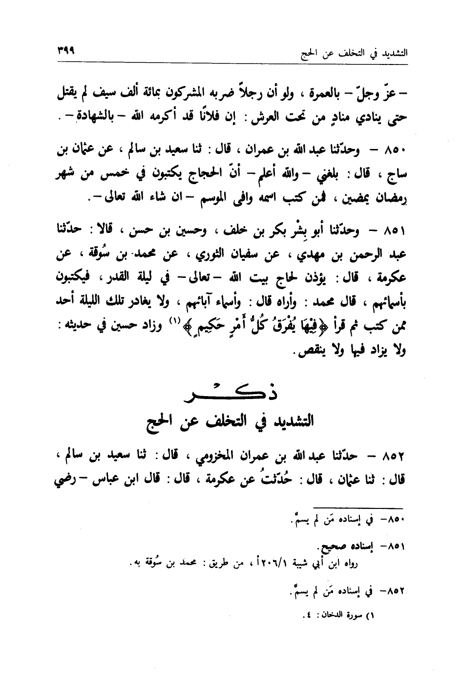 851 - وَحَدَّثَنَا أَبُو بِشْرٍ بَكْرُ بْنُ خَلَفٍ، وَحُسَيْنُ بْنُ حَسَنٍ قَالَا: حَدَّثَنَا عَبْدُ الرَّحْمَنِ بْنُ مَهْدِيٍّ، عَنْ سُفْيَانَ الثَّوْرِيِّ، عَنْ مُحَمَّدِ بْنِ سُوقَةَ، عَنْ عِكْرِمَةَ قَالَ: " §يُؤْذَنُ لِحُجَّاجِ بَيْتِ اللهِ تَعَالَى فِي لَيْلَةِ الْقَدْرِ، فَيُكْتَبُونَ بِأَسْمَائِهِمْ " قَالَ مُحَمَّدٌ: وَأُرَاهُ قَالَ: " وَأَسْمَاءِ آبَائِهِمْ، وَلَا يُغَادِرُ تِلْكَ اللَّيْلَةَ أَحَدٌ مِمَّنْ كُتِبَ، ثُمَّ قَرَأَ {فِيهَا يُفْرَقُ كُلُّ أَمْرٍ حَكِيمٍ} [الدخان: 4] " وَزَادَ حُسَيْنٌ فِي حَدِيثِهِ: " وَلَا يُزَادُ فِيهَا وَلَا يُنْقَصُ "