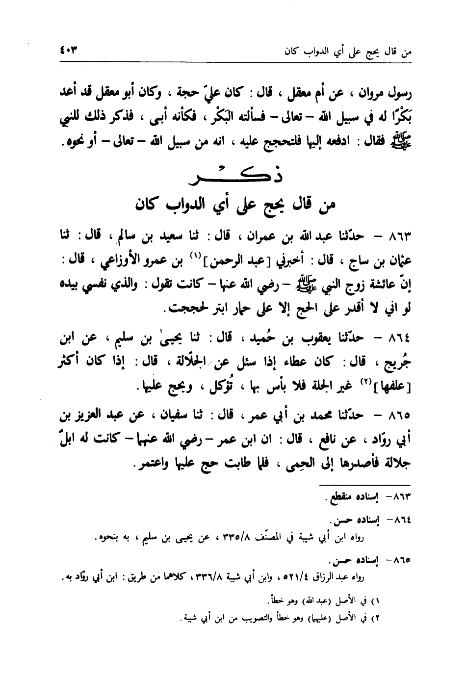 863 - حَدَّثَنَا عَبْدُ اللهِ بْنُ عِمْرَانَ قَالَ: ثنا سَعِيدُ بْنُ سَالِمٍ قَالَ: ثنا عُثْمَانُ بْنُ سَاجٍ قَالَ: أَخْبَرَنِي عَبْدُ الرَّحْمَنِ بْنُ عَمْرٍو الْأَوْزَاعِيُّ قَالَ: إِنَّ عَائِشَةَ زَوْجَ النَّبِيِّ صَلَّى اللَّهُ عَلَيْهِ وَسَلَّمَ رَضِيَ اللهُ عَنْهَا، كَانَتْ تَقُولُ: " وَالَّذِي نَفْسِي بِيَدِهِ §لَوْ أَنِّي لَا أَقْدِرُ عَلَى الْحَجِّ إِلَّا عَلَى حِمَارٍ أَبْتَرَ لَحَجَجْتُ "
