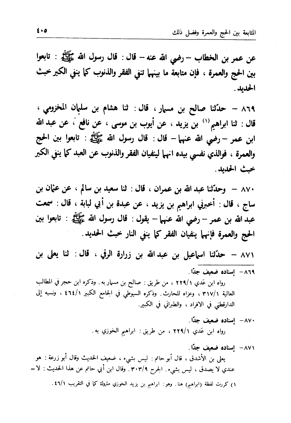 870 - وَحَدَّثَنَا عَبْدُ اللهِ بْنُ عِمْرَانَ قَالَ: ثنا سَعِيدُ بْنُ سَالِمٍ، عَنْ عُثْمَانَ بْنِ سَاجٍ قَالَ: أَخْبَرَنِي إِبْرَاهِيمُ بْنُ يَزِيدَ، عَنْ عَبْدَةَ بْنِ أَبِي لُبَابَةَ قَالَ: سَمِعْتُ عَبْدَ اللهِ بْنَ عُمَرَ رَضِيَ اللهُ عَنْهُمَا يَقُولُ: قَالَ رَسُولُ اللهِ صَلَّى اللَّهُ عَلَيْهِ وَسَلَّمَ: " §تَابِعُوا بَيْنَ الْحَجِّ وَالْعُمْرَةِ، فَإِنَّهُمَا يَنْفِيَانِ الْفَقْرَ كَمَا يَنْفِي النَّارُ خَبَثَ الْحَدِيدِ "
