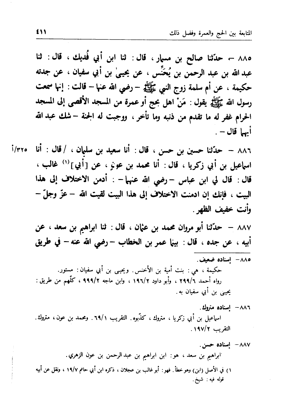 887 - حَدَّثَنَا أَبُو مَرْوَانَ مُحَمَّدُ بْنُ عُثْمَانَ قَالَ: ثنا إِبْرَاهِيمُ بْنُ سَعْدٍ، عَنْ أَبِيهِ، عَنْ جَدِّهِ قَالَ: بَيْنَمَا عُمَرُ بْنُ الْخَطَّابِ رَضِيَ اللهُ عَنْهُ فِي طَرِيقِ -[412]- مَكَّةَ، وَهُوَ يُحَدِّثُ نَفْسَهُ، إِذْ نَظَرَ إِلَى النَّاسِ مُحْرِمِينَ، فَجَعَلَ يُحَدِّثُ نَفْسَهُ، ثُمَّ قَالَ: " §تُشَعِّثُونَ وَتُغَبِّرُونَ وَتَثْفُلُونَ وَتَضِجُّونَ، لَا تُرِيدُونُ بِذَلِكَ شَيْئًا مِنْ عَرَضِ الدُّنْيَا، مَا نَعْلَمُ سَفَرًا خَيْرًا مِنْ هَذَا " يَعْنِي الْحَجَّ