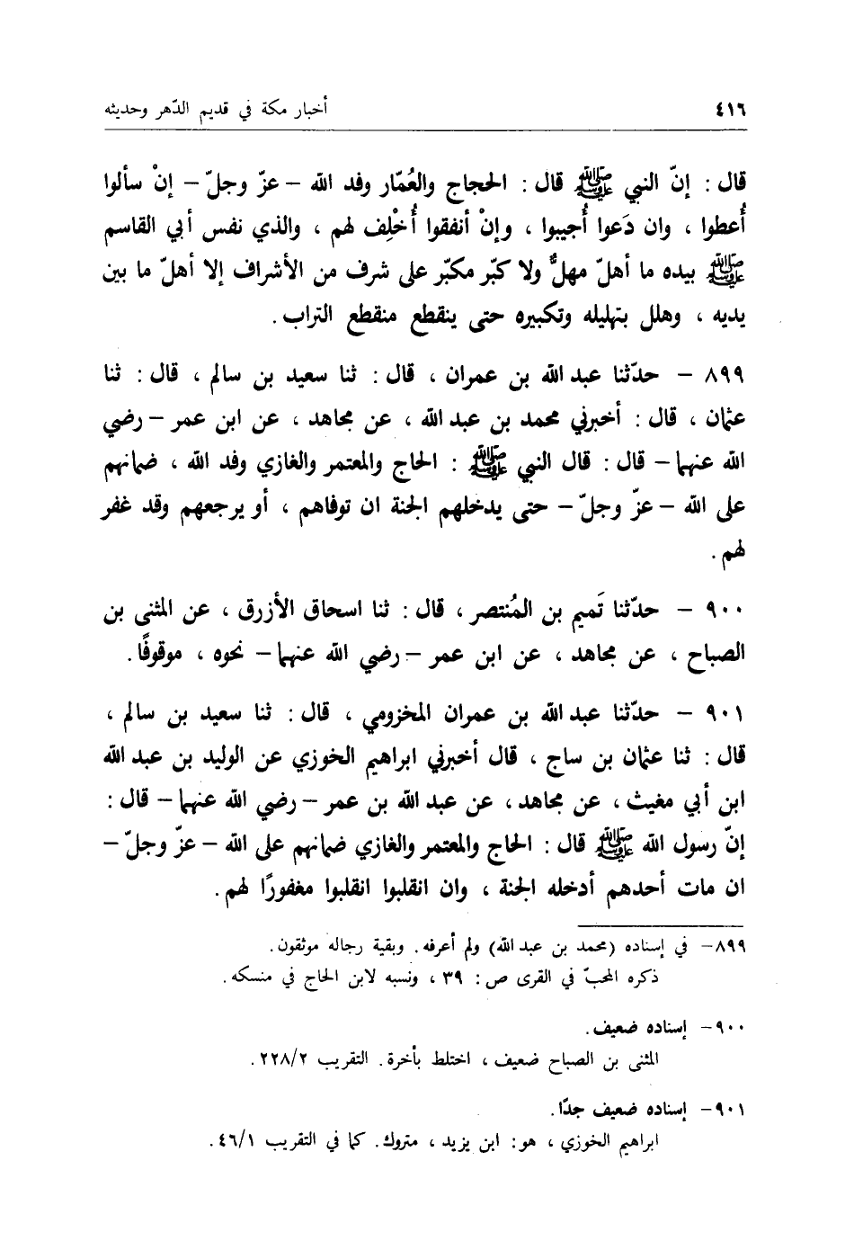 901 - حَدَّثَنَا عَبْدُ اللهِ بْنُ عِمْرَانَ الْمَخْزُومِيُّ قَالَ: ثنا سَعِيدُ بْنُ سَالِمٍ قَالَ: ثنا عُثْمَانُ بْنُ سَاجٍ قَالَ: أَخْبَرَنِي إِبْرَاهِيمُ الْخُوزِيُّ، عَنِ الْوَلِيدِ بْنِ عَبْدِ اللهِ بْنِ أَبِي مُغِيثٍ، عَنْ مُجَاهِدٍ، عَنْ عَبْدِ اللهِ بْنِ عُمَرَ رَضِيَ اللهُ عَنْهُمَا قَالَ: إِنَّ رَسُولَ اللهِ صَلَّى اللَّهُ عَلَيْهِ وَسَلَّمَ قَالَ: " §الْحَاجُّ وَالْمُعْتَمِرُ وَالْغَازِي ضَمَانُهُمْ عَلَى اللهِ عَزَّ وَجَلَّ إِنْ مَاتَ أَحَدُهُمْ أَدْخَلَهُ الْجَنَّةَ، وَإِنْ انْقَلَبُوا انْقَلَبُوا مَغْفُورًا لَهُمْ "