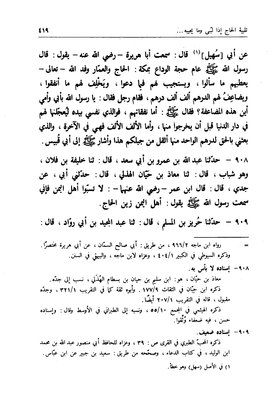 909 - حَدَّثَنَا حَرِيزُ بْنُ الْمُسْلِمِ قَالَ: ثنا عَبْدُ الْمَجِيدِ بْنُ أَبِي رَوَّادٍ -[420]- قَالَ: حَدَّثَنِي مُحَدِّثٌ، عَنْ زَيْدِ بْنِ الْحَوَارِيِّ، عَنِ ابْنِ عَبَّاسٍ رَضِيَ اللهُ عَنْهُمَا قَالَ: قَالَ رَسُولُ اللهِ صَلَّى اللَّهُ عَلَيْهِ وَسَلَّمَ: " §خَمْسُ دَعَوَاتٍ لَا يُرْدَدْنَ: دَعْوَةُ الْحَاجِّ حَتَّى يَصْدُرَ، وَدَعْوَةُ الْغَازِي حَتَّى يَرْجِعَ، وَدَعْوَةُ الْمَظْلُومِ حَتَّى يُنْصَرَ، وَدَعْوَةُ الْمَرِيضِ حَتَّى يَبْرَأَ، وَدَعْوَةُ الرَّجُلِ لِأَخِيهِ بِظَهْرِ الْغَيْبِ " قَالَ: وَقَالَ ابْنُ عَبَّاسٍ رَضِيَ اللهُ عَنْهُمَا: إِنَّ النَّبِيَّ صَلَّى اللَّهُ عَلَيْهِ وَسَلَّمَ قَالَ: " وَأَعْجَلُهُنَّ عِنْدَ اللهِ تَعَالَى دَعْوَةُ الْأَخِ لِأَخِيهِ بِظَهْرِ الْغَيْبِ "