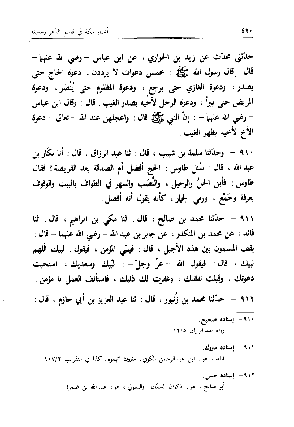 912 - حَدَّثَنَا مُحَمَّدُ بْنُ زُنْبُورٍ قَالَ: ثنا عَبْدُ الْعَزِيزِ بْنُ أَبِي حَازِمٍ -[421]- قَالَ: ثنا سُهَيْلُ بْنُ أَبِي صَالِحٍ، عَنْ أَبِيهِ، عَنِ السَّلُولِيِّ قَالَ: إِنَّ كَعْبَ الْأَحْبَارِ قَالَ: " §الْغَازِي وَافِدٌ عَلَى اللهِ تَعَالَى، وَالْحَاجُّ وَافِدٌ عَلَى اللهِ عَزَّ وَجَلَّ، كُلَّمَا كَبَّرَ مِنْهُمْ مُكَبِّرٌ وَأَهَلَّ بَلَّغَتْهُ الْمَلَائِكَةُ بِالْبُشْرَى " فَقَالَ مِرْدَاسٌ: بِمَاذَا يُبَشِّرُونَهُ؟ قَالَ كَعْبٌ: " فَهِمْتَ مَنْ أَنْتَ يَا ابْنَ أَخِي؟ " فَانْتَسَبَ لَهُ، فَقَالَ كَعْبٌ: " فَإِنَّا نَزْعُمُ ذَلِكَ "