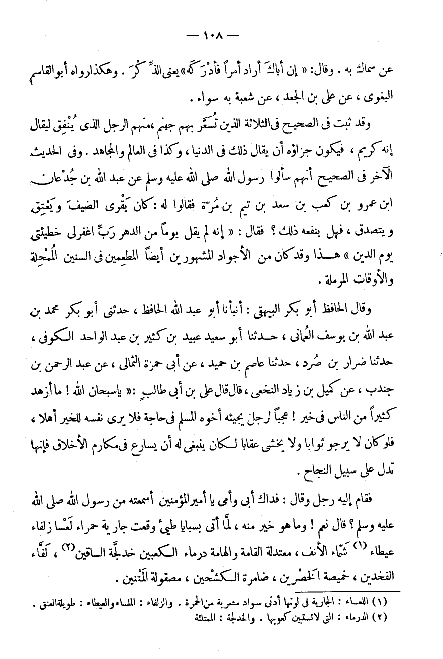 وَقَالَ الْحَافِظُ أَبُو بَكْرٍ الْبَيْهَقِيُّ: أَنْبَأَنَا أَبُو عَبْدِ اللَّهِ الْحَافِظُ، حَدَّثَنِي أَبُو بَكْرٍ مُحَمَّدُ بْنُ عَبْدِ اللَّهِ بْنُ يُوسُفَ الْعُمَانِيُّ، حَدَّثَنَا أَبُو سَعِيدٍ عُبَيْدُ بْنُ كَثِيرِ بْنِ عَبْدِ الْوَاحِدِ الْكُوفِيُّ، حَدَّثَنَا ضِرَارُ بْنُ صُرَدَ، حَدَّثَنَا عَاصِمُ بْنُ حُمَيْدٍ، عَنْ أَبِي حَمْزَةَ الثُّمَالِيِّ، عَنْ عَبْدِ الرَّحْمَنِ بْنِ جُنْدُبٍ، عَنْ كُمَيْلِ بْنِ زِيَادٍ النَّخَعِيِّ، قَالَ قَالَ عَلِيُّ بْنُ أَبِي طَالِبٍ: " يَا سُبْحَانَ اللَّهِ! مَا أَزْهَدَ كَثِيرًا مِنَ النَّاسِ فِي خَيْرٍ! عَجَبًا لِرَجُلٍ يَجِيئُهُ أَخُوهُ الْمُسْلِمُ فِي حَاجَةٍ فَلَا يَرَى نَفْسَهُ لِلْخَيْرِ أَهْلًا، فَلَوْ كَانَ لَا يَرْجُو ثَوَابًا وَلَا يَخْشَى عِقَابًا لَكَانَ يَنْبَغِي لَهُ أَنْ يُسَارِعَ فِي مَكَارِمِ الْأَخْلَاقِ فَإِنَّهَا تَدُلُّ عَلَى سَبِيلِ النَّجَاحِ.
