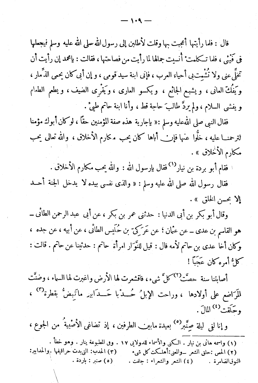 قَالَ: فَلَمَّا رَأَيْتُهَا أُعْجِبْتُ بِهَا وَقُلْتُ لَأَطْلُبَنَّ إِلَى رَسُولِ اللَّهِ صَلَّى اللَّهُ عَلَيْهِ وَسَلَّمَ فَيَجْعَلُهَا فِي فَيْئِي، فَلَمَّا تَكَلَّمْتُ أُنْسِيتُ جَمَالَهَا لِمَا رَأَيْتُ مِنْ فَصَاحَتِهَا، فَقَالَتْ: يَا مُحَمَّدُ إِنْ رَأَيْتَ أَنْ تُخَلِّيَ عَنِّي وَلَا تُشْمِتْ بِيَ أَحْيَاءَ الْعَرَبِ، فَإِنِّي ابْنَةُ سَيِّدِ قَوْمِي، وَإِنَّ أَبِي كَانَ يَحْمِي الذِّمَارَ، وَيَفُكُّ الْعَانِيَ، وَيُشْبِعُ الْجَائِعَ، وَيَكْسُو الْعَارِيَ، وَيَقْرِي الضَّيْفَ، وَيُطْعِمُ الطَّعَامَ وَيُفْشِي السَّلَامَ، وَلَمْ يَرُدَّ طَالِبَ حَاجَةٍ قَطُّ، وَأَنَا ابْنَةُ حَاتِمِ طَيِّئٍ.