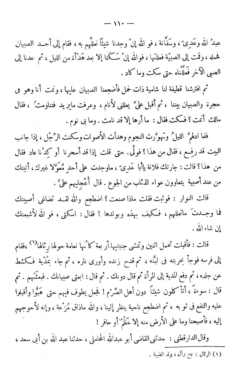 عبد الله وعدى، وسفانة، فو الله إِنْ وَجَدْنَا شَيْئًا نُعَلِّلُهُمْ بِهِ، فَقَامَ إِلَى أحد الصّبيان فَحَمله، وَقمت إِلَى الصبية فعللتها، فو الله إِنْ سَكَتَا إِلَّا بَعْدَ هَدْأَةٍ مِنَ اللَّيْلِ، ثُمَّ عُدْنَا إِلَى الصَّبِيِّ الْآخَرِ فَعَلَّلْنَاهُ حَتَّى سَكَتَ وَمَا كَادَ.