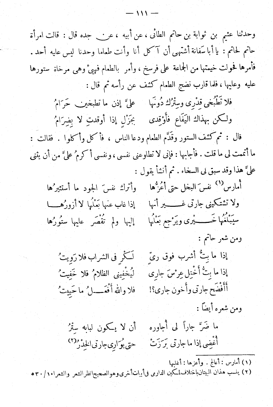 ثمَّ أنشأ يَقُول: أمارس (1) نفس الْبُخْل حَتَّى أعزها * وأترك نفس الْجُود مَا أستثيرها وَلَا تَشْتَكِينِي جَارَتِي غَيْرَ أَنَّهَا * إِذَا غَابَ عَنْهَا بَعْلُهَا لَا أَزُورُهَا سَيَبْلُغُهَا خَيْرِي وَيَرْجِعُ بَعْلُهَا * إِلَيْهَا وَلَمْ تُقْصَرْ عَلَيْهَا سُتُورُهَا وَمِنْ شِعْرِ حَاتِمٍ: إِذَا مَا بِتُّ أَشْرَبُ فَوْقَ رى * لِسُكْرٍ فِي الشَّرَابِ فَلَا رَوِيتُ إِذَا مَا بِتُّ أَخْتِلُ عِرْسَ جَارِي * لِيُخْفِيَنِي الظَّلَامُ فَلَا خَفِيتُ أَأَفْضَحُ جَارَتِي وَأَخُونُ جَارِي؟ ! * فَلَا وَاللَّهِ أَفْعَلُ مَا حَيِيتُ وَمِنْ شَعْرِهِ أَيْضًا: مَا ضَرَّ جَارًا لِي أُجَاوِرُهُ * أَنْ لَا يَكُونَ لِبَابِهِ سِتْرُ أُغْضِي إِذَا مَا جَارَتِي بَرَزَتْ * حَتَّى يوارى جارتي الخدر (2)