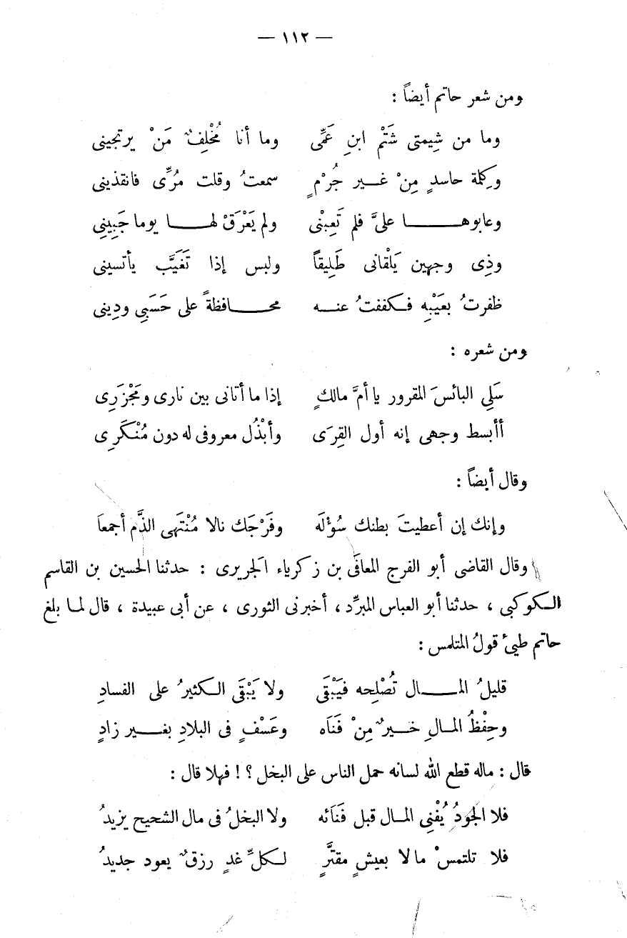 سَلِي الْبَائِسَ الْمَقْرُورَ يَا أُمَّ مَالِكٍ * إِذَا مَا أَتَانِي بَيْنَ نَارِي وَمَجْزَرِي أَأَبْسُطُ وَجْهِي إِنَّهُ أَوَّلُ الْقِرَى * وَأَبْذُلُ مَعْرُوفِي لَهُ دُونَ مُنْكَرِي وَقَالَ أَيْضًا: وَإِنَّكَ إِنْ أَعْطَيْتَ بَطْنَكَ سُؤْلَهُ * وَفَرْجَكَ نَالَا مُنْتَهَى الذَّمِّ أَجْمَعَا وَقَالَ الْقَاضِي أَبُو الْفَرَجِ الْمُعَافَى بْنُ زَكَرِيَّاءَ الْجَرِيرِيُّ: حَدَّثَنَا الْحُسَيْنُ بْنُ الْقَاسِمِ الْكَوْكَبِيُّ، حَدَّثَنَا أَبُو الْعَبَّاسِ الْمُبَرِّدُ، أَخْبَرَنِي الثَّوْرِيُّ، عَنْ أَبِي عُبَيْدَةَ، قَالَ لَمَّا بَلَغَ حَاتِمَ طَيِّئٍ قَوْلُ الْمُتَلَمِّسِ: قَلِيلُ الْمَالِ تُصْلِحُهُ فَيَبْقَى * وَلَا يَبْقَى الْكَثِيرُ عَلَى الْفَسَادِ وَحِفْظُ الْمَالِ خَيْرٌ مِنْ فَنَاهُ * وَعَسْفٍ فِي الْبِلَادِ بِغَيْرِ زَادِ قَالَ: مَالَهُ قَطَعَ اللَّهُ لِسَانَهُ حَمَلَ النَّاسَ عَلَى الْبُخْلِ؟ ! فَهَلَّا قَالَ: فَلَا الْجُودُ يُفْنِي الْمَالَ قَبْلَ فَنَائِهِ * وَلَا الْبُخْلُ فِي مَالِ الشَّحِيحِ يَزِيدُ فَلَا تَلْتَمِسْ مَالًا بِعَيْشٍ مُقَتَّرٍ * لِكُلِّ غَدٍ رِزْقٌ يعود جَدِيد