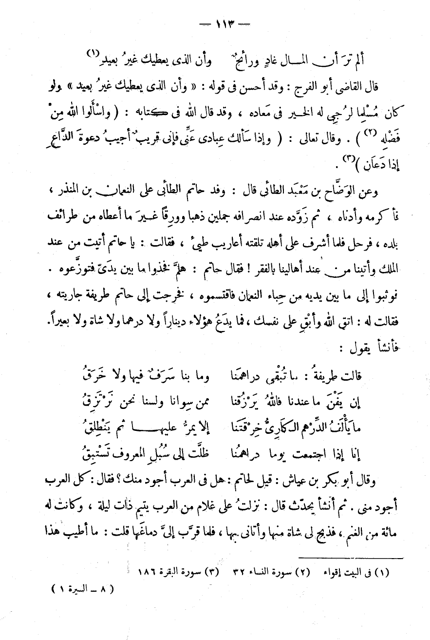 أَلَمْ تَرَ أَنَّ الْمَالَ غَادٍ وَرَائِحٌ * وَأَنَّ الَّذِي يُعْطِيكَ غَيْرُ بَعِيدِ (1) قَالَ الْقَاضِي أَبُو الْفرج: وَقد أَحْسَنَ فِي قَوْلِهِ: " وَأَنَّ الَّذِي يُعْطِيكَ غَيْرُ بَعِيدِ " وَلَوْ كَانَ مُسْلِمًا لَرُجِيَ لَهُ الْخَيْرُ فِي مَعَادِهِ، وَقَدْ قَالَ اللَّهُ فِي كِتَابِهِ: (واسألوا الله من فَضله (2) .