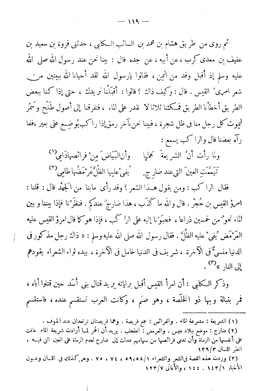 ثُمَّ رَوَى مِنْ طَرِيقِ هِشَامِ بْنِ مُحَمَّدِ بْنِ السَّائِبِ الْكَلْبِيِّ، حَدَّثَنِي فَرْوَةُ بْنُ سَعِيدِ بْنِ عَفِيفِ بْنِ مَعْدِي كَرِبَ، عَنْ أَبِيهِ، عَنْ جَدِّهِ قَالَ: بَيْنَا نَحْنُ عِنْدَ رَسُولِ اللَّهِ صَلَّى اللَّهُ عَلَيْهِ وَسَلَّمَ إِذْ أَقْبَلَ وَفْدٌ مِنَ الْيَمَنِ، فَقَالُوا يَا رَسُولَ اللَّهِ لَقَدْ أَحْيَانَا اللَّهُ بِبَيْتَيْنِ مِنْ شِعْرِ امْرِئِ الْقَيْسِ.