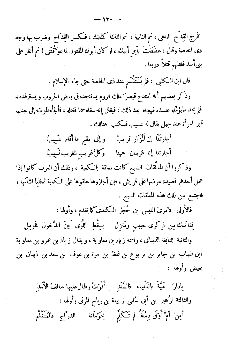 أَجَارَتَنَا إِنَّ الْمَزَارَ قَرِيبٌ * وَإِنِّي مُقِيمٌ مَا أَقَامَ عَسِيبُ أجارتنا إِنَّا غَرِيبَانِ هَهُنَا * وكل غَرِيب للغريب نسيب وَذكروا أَنَّ الْمُعَلَّقَاتِ السَّبْعَ كَانَتْ مُعَلَّقَةً بِالْكَعْبَةِ، وَذَلِكَ أَنَّ الْعَرَبَ كَانُوا إِذَا عَمِلَ أَحَدُهُمْ قَصِيدَةً عَرَضَهَا عَلَى قُرَيْشٍ، فَإِنْ أَجَازُوهَا عَلَّقُوهَا عَلَى الْكَعْبَةِ تَعْظِيمًا لِشَأْنِهَا، فَاجْتَمَعَ مِنْ ذَلِكَ هَذِهِ الْمُعَلَّقَاتُ السَّبْعُ.