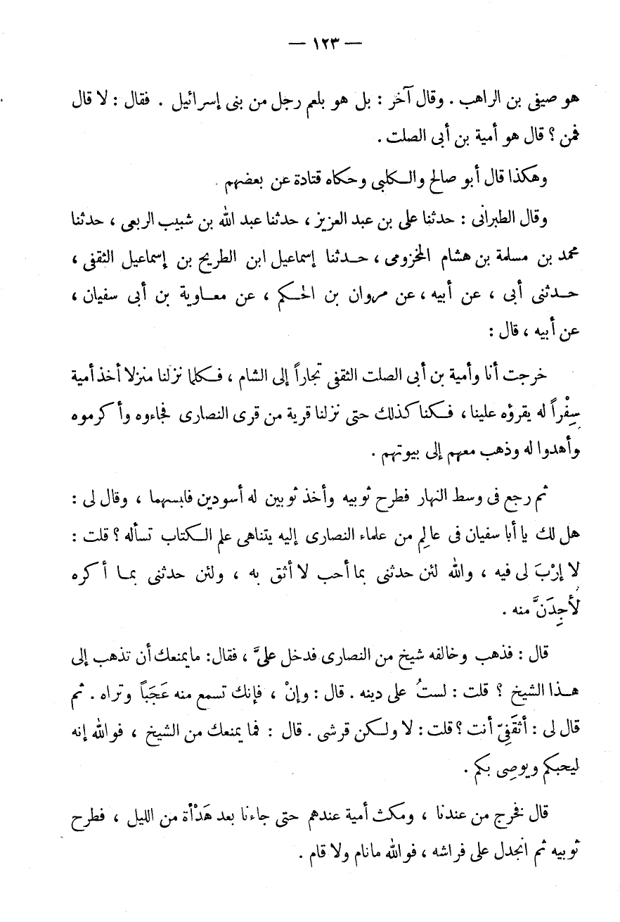 وَهَكَذَا قَالَ أَبُو صَالِحٍ وَالْكَلْبِيُّ وَحَكَاهُ قَتَادَةُ عَنْ بَعْضِهِمْ وَقَالَ الطَّبَرَانِيُّ: حَدَّثَنَا عَلِيُّ بْنُ عَبْدِ الْعَزِيزِ، حَدَّثَنَا عَبْدُ اللَّهِ بْنُ شَبِيبٍ الرَّبَعِيُّ، حَدثنَا مُحَمَّد بن مسلمة بن هِشَام المخزومى، حَدثنَا إِسْمَاعِيل ابْن الطَّرِيحِ بْنِ إِسْمَاعِيلَ الثَّقَفِيُّ، حَدَّثَنِي أَبِي، عَنْ أَبِيهِ، عَنْ مَرْوَانَ بْنِ الْحَكَمِ، عَنْ مُعَاوِيَةَ بْنِ أَبِي سُفْيَانَ، عَنْ أَبِيهِ، قَالَ: خَرَجْتُ أَنَا وَأُمَيَّةُ بْنُ أَبِي الصَّلْتِ الثَّقَفِيُّ تُجَّارًا إِلَى الشَّامِ، فَكُلَّمَا نَزَلْنَا مَنْزِلًا أَخَذَ أُمَيَّةُ سِفْرًا لَهُ يَقْرَؤُهُ عَلَيْنَا، فَكُنَّا كَذَلِكَ حَتَّى نزلنَا قَرْيَة من قرى النَّصَارَى فجاءوه وَأَكْرَمُوهُ وَأَهْدَوْا لَهُ وَذَهَبَ مَعَهُمْ إِلَى بُيُوتِهِمْ.