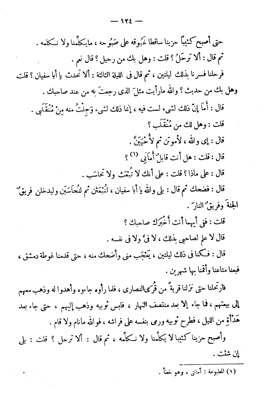 فرحلنا فسرنا بذلك لَيْلَتَيْنِ، ثُمَّ قَالَ فِي اللَّيْلَةِ الثَّالِثَةِ: أَلَا تَحَدَّثُ يَا أَبَا سُفْيَانَ؟ قُلْتُ