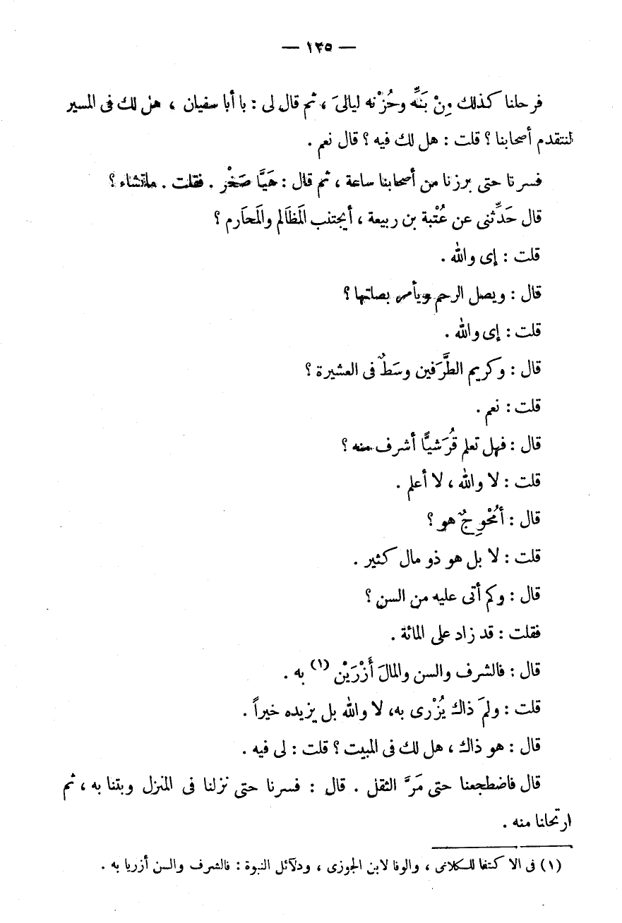 فرحلنا كَذَلِك من بنه وَحُزْنِهِ لَيَالِيَ، ثُمَّ قَالَ لِي: يَا أَبَا سُفْيَانَ، هَلْ لَكَ فِي الْمَسِيرِ لِنَتَقَدَّمَ أَصْحَابَنَا؟ قُلْتُ: هَلْ لَكَ فِيهِ؟ قَالَ نَعَمْ.