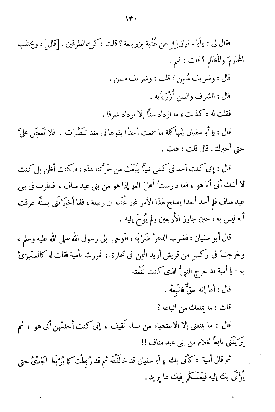 قُلْتُ: مَا يَمْنَعُكَ مِنِ اتِّبَاعِهِ؟ قَالَ: مَا يمنعنى إِلَّا الاستحياء من نسَاء ثَقِيفٍ، إِنِّي كُنْتُ أُحَدِّثُهُنَّ أَنِّي هُوَ، ثُمَّ يَرَيْنَنِي تَابِعًا لِغُلَامٍ مِنْ بَنِي عَبْدِ مَنَافٍ! ! ثمَّ قَالَ أُميَّة: كأنى بك يَا أَبَا سُفْيَان قد خالفته ثمَّ قَدْ رُبِطْتَ كَمَا يُرْبَطُ الْجَدْيُ حَتَّى يُؤْتَى بِكَ إِلَيْهِ فَيَحْكُمَ فِيكَ بِمَا يُرِيدُ.