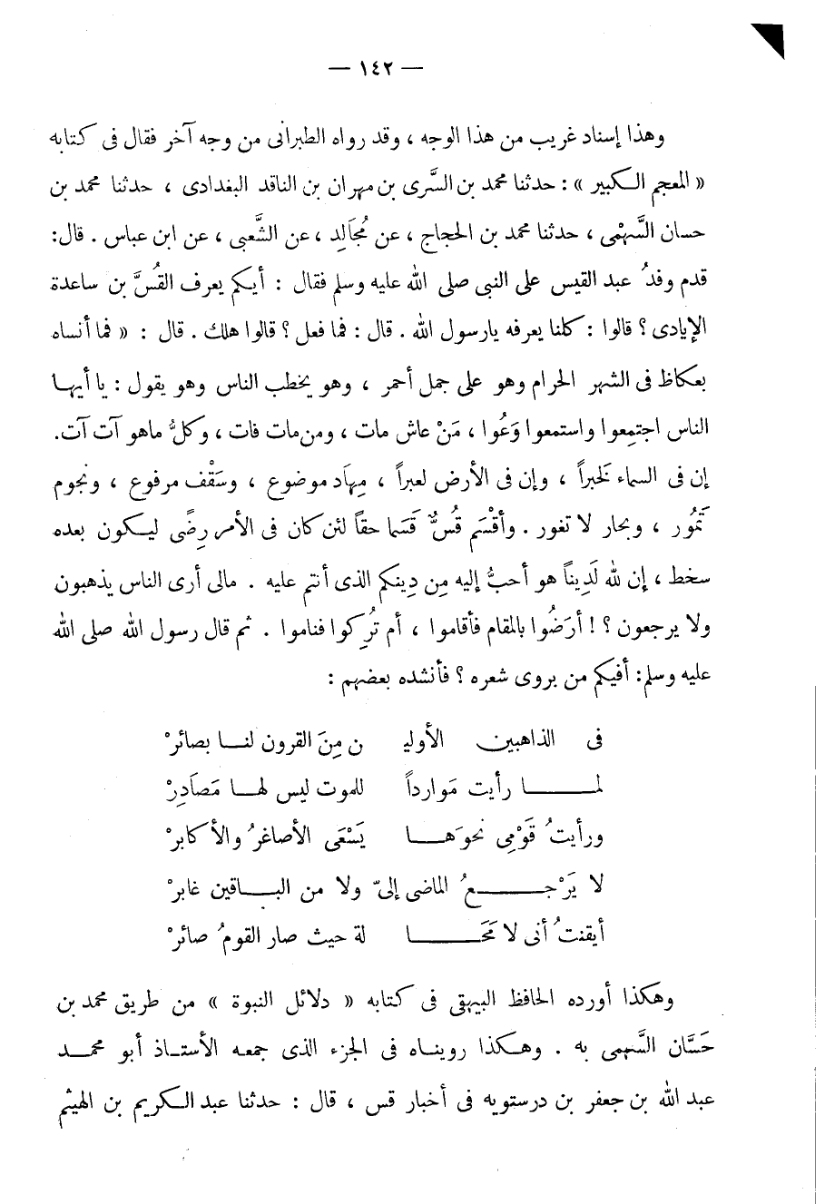 قَالَ: قَدِمَ وَفْدُ عَبْدِ الْقَيْسِ عَلَى النَّبِيِّ صَلَّى اللَّهُ عَلَيْهِ وَسَلَّمَ فَقَالَ: أَيُّكُمْ يَعْرِفُ الْقُسَّ بْنَ سَاعِدَةَ الْإِيَادِيَّ؟ قَالُوا: كُلُّنَا يَعْرِفُهُ يَا رَسُولَ اللَّهِ.