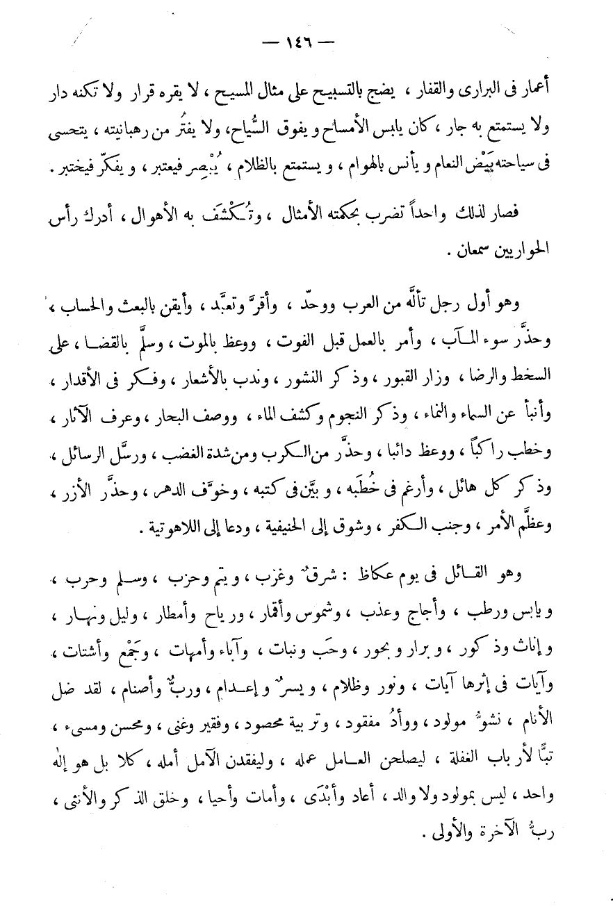وَهُوَ أَوَّلُ رَجُلٍ تَأَلَّهَ مِنَ الَعَرَبِ وَوَحَّدَ، وَأَقَرَّ وَتَعَبَّدَ، وَأَيْقَنَ بِالْبَعْثِ وَالْحِسَابِ، وَحَذِرَ سُوءَ الْمَآبِ، وَأَمَرَ بِالْعَمَلِ قَبْلَ الْفَوْتِ، وَوَعَظَ بِالْمَوْتِ، وَسَلَّمَ بالْقَضَا، عَلَى السُّخْطِ وَالرِّضَا، وَزَارَ الْقُبُورَ، وَذَكَرَ النُّشُورَ، وَنَدَبَ بِالْأَشْعَارِ، وَفَكَّرَ فِي الْأَقْدَارِ، وَأَنْبَأَ عَنِ السَّمَاءِ وَالنَّمَاءِ، وَذَكَرَ النُّجُومَ وَكَشَفَ الْمَاءَ، وَوَصَفَ الْبِحَارَ، وَعَرَفَ الْآثَارَ، وَخَطَبَ رَاكِبًا، وَوَعَظَ دَائِبًا، وَحَذَّرَ مِنَ الَكَرْبِ وَمِنْ شَدَّةِ الْغَضَبِ، وَرَسَّلَ الرَّسَائِلَ، وَذَكَرَ كُلَّ هَائِلٍ، وَأَرْغَمَ فِي خُطَبِهِ، وَبَيَّنَ فِي كُتُبِهِ، وَخَوَّفَ الدَّهْرَ، وَحَذَّرَ الْأَزْرَ، وَعَظَّمَ الْأَمْرَ، وَجَنَّبَ الْكُفْرَ، وَشَوَّقَ إِلَى الْحَنِيفِيَّةِ، وَدَعَا إِلَى اللَّاهُوتِيَّةِ.