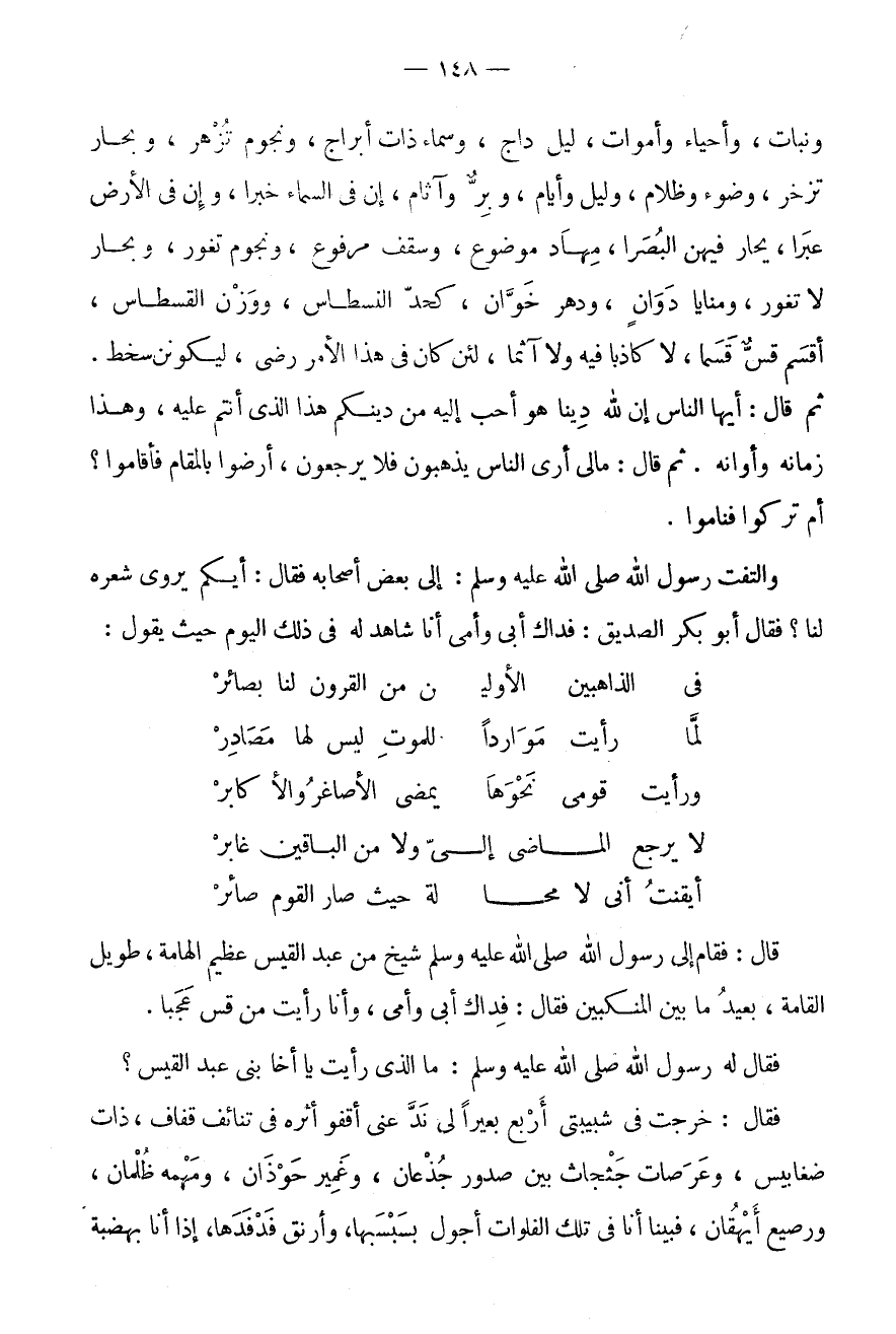 وَالْتَفَتَ رَسُولُ اللَّهِ صَلَّى اللَّهُ عَلَيْهِ وَسَلَّمَ: إِلَى بَعْضِ أَصْحَابِهِ فَقَالَ: أَيُّكُمْ يَرْوِي شِعْرَهُ لَنَا؟ فَقَالَ أَبُو بَكْرٍ الصِّدِّيقُ: فِدَاكَ أَبِي وَأُمِّي أَنَا شَاهِدٌ لَهُ فِي ذَلِكَ الْيَوْمِ حَيْثُ يَقُولُ: فِي الذَّاهِبِينَ الْأَوَّلِي * نَ مِنَ الْقُرُونِ لَنَا بَصَائِرْ لَمَّا رَأَيْتُ مَوَارِدًا * لِلْمَوْتِ لَيْسَ لَهَا مَصَادِرْ وَرَأَيْت قومِي نَحْوهَا * يمْضِي الأصاغر والأكابر لَا يرجع الْمَاضِي إل * ي وَلَا مِنَ الْبَاقِينَ غَابِرْ أَيْقَنْتُ أَنِّي لَا محا * لَة حَيْثُ صَارَ الْقَوْمُ صَائِرْ قَالَ: فَقَامَ إِلَى رَسُولِ اللَّهِ صَلَّى اللَّهُ عَلَيْهِ وَسَلَّمَ شَيْخٌ مِنْ عَبْدِ الْقَيْسِ عَظِيمُ الْهَامَةِ، طَوِيلُ الْقَامَةِ، بَعِيدُ مَا بَيْنَ الْمَنْكِبَيْنِ فَقَالَ: فِدَاكَ أَبِي وَأُمِّي، وَأَنَا رَأَيْتُ مِنْ قُسٍّ عَجَبًا.