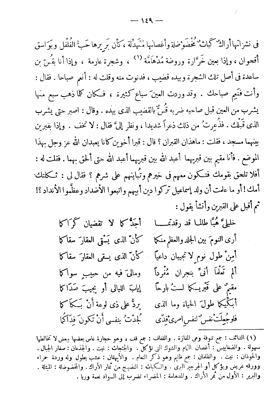 فَقُلْتُ لَهُ: أَفَلَا تَلْحَقُ بِقَوْمِكَ فَتَكُونَ مَعَهُمْ فِي خَيْرِهِمْ وَتُبَايِنَهُمْ عَلَى شَرِّهِمْ؟ فَقَالَ لِي: ثكلتك أمك! أَو مَا عَلِمْتَ أَنَّ وَلَدَ إِسْمَاعِيلَ تَرَكُوا دِينَ أَبِيهِمْ وَاتَّبَعُوا الْأَضْدَادَ وَعَظَّمُوا الْأَنْدَادَ؟ ! ثُمَّ أَقْبَلَ عَلَى الْقَبْرَيْنِ وَأَنْشَأَ يَقُولُ: خَلِيلَيَّ هُبَّا طَالَمَا قَدْ رَقَدْتُمَا * أَجِدَّكَمَا لَا تَقْضِيَانِ كَرَاكُمَا أَرَى النَّوْمَ بَيْنَ الْجِلْدِ وَالْعَظْمِ مِنْكُمَا * كَأَنَّ الَّذِي يَسْقِي الْعُقَارَ سَقَاكُمَا أَمِنْ طُولِ نَوْمٍ لَا تُجِيبَانِ دَاعِيًا * كَأَنَّ الَّذِي يَسْقِي الْعُقَارَ سَقَاكُمَا أَلَمْ تعلما أَنى بِنَجْرَان مُفردا * ومالى فِيهِ مِنْ حَبِيبٍ سِوَاكُمَا مُقِيمٌ عَلَى قَبْرَيْكُمَا لَسْتُ بَارِحًا * إِيَابَ اللَّيَالِي أَوْ يُجِيبَ صَدَاكُمَا أبكيكما طُولَ الْحَيَاةِ وَمَا الَّذِي * يَرُدُّ عَلَى ذِي لَوْعَةٍ أَنْ بَكَاكُمَا فُلَوْ جُعِلَتْ نَفْسٌ لِنَفْسِ امْرِئٍ فِدًى * لَجُدْتُ بِنَفْسِي أَنْ تَكُونَ فِدَاكُمَا