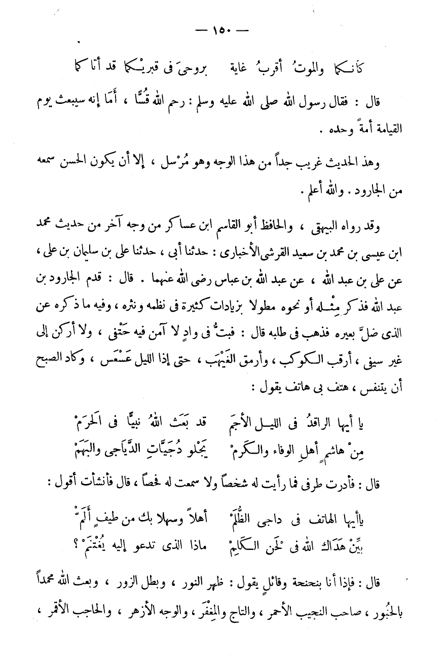 قَالَ: قَدِمَ الْجَارُودُ بْنُ عَبْدِ اللَّهِ فَذَكَرَ مِثْلَهُ أَوْ نَحْوَهُ مُطَوَّلًا بِزِيَادَاتٍ كَثِيرَةٍ فِي نَظْمِهِ وَنَثْرِهِ، وَفِيهِ مَا ذَكَرَهُ عَنِ الَّذِي ضَلَّ بِعِيرُهُ فَذَهَبَ فِي طَلَبِهِ قَالَ: فَبِتُّ فِي وَادٍ لَا آمَنُ فِيهِ حَتْفِي، وَلَا أركن إِلَى غير سيفى، أرقب الْكَوَاكِب، وَأَرْمُقُ الْغَيْهَبَ، حَتَّى إِذَا اللَّيْلُ عَسْعَسَ، وَكَادَ الصُّبْحُ أَنْ يَتَنَفَّسَ، هَتَفَ بِيَ هَاتِفٌ يَقُولُ: يَا أَيُّهَا الرَّاقِدُ فِي اللَّيْلِ الْأَجَمْ * قَدْ بَعَثَ اللَّهُ نَبِيًّا فِي الْحَرَمْ مِنْ هَاشِمٍ أهل الْوَفَاء وَالْكَرم * يجلو دجيات الدَّيَاجِي وَالْبُهَمْ قَالَ: فَأَدَرْتُ طَرْفِي فَمَا رَأَيْتُ لَهُ شَخْصًا وَلَا سَمِعْتُ لَهُ فَحْصًا، قَالَ فَأَنْشَأْتُ أَقُولُ: يَا أَيُّهَا الْهَاتِفُ فِي دَاجِي الظُّلَمْ * أَهْلًا وَسَهْلًا بِكَ مِنْ طَيْفٍ أَلَمْ