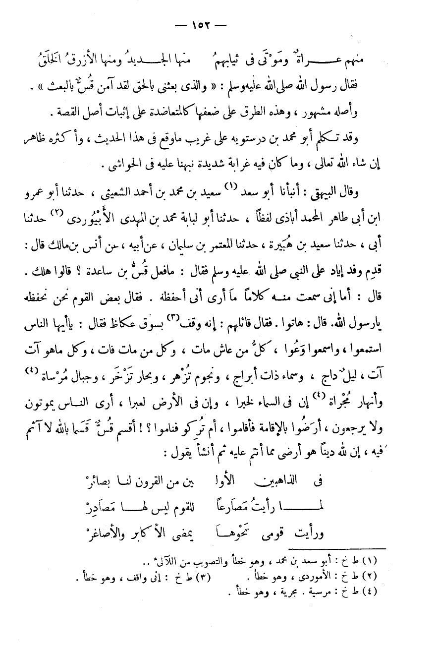 مِنْهُمْ عُرَاةٌ وَمَوْتَى فِي ثِيَابِهِمُ * مِنْهَا الْجَدِيدُ وَمِنْهَا الْأَزْرَقُ الْخَلَقُ فَقَالَ رَسُولُ اللَّهِ صَلَّى اللَّهُ عَلَيْهِ وَسَلَّمَ: " وَالَّذِي بَعَثَنِي بِالْحَقِّ لَقَدْ آمَنَ قُسٌّ بِالْبَعْثِ ".