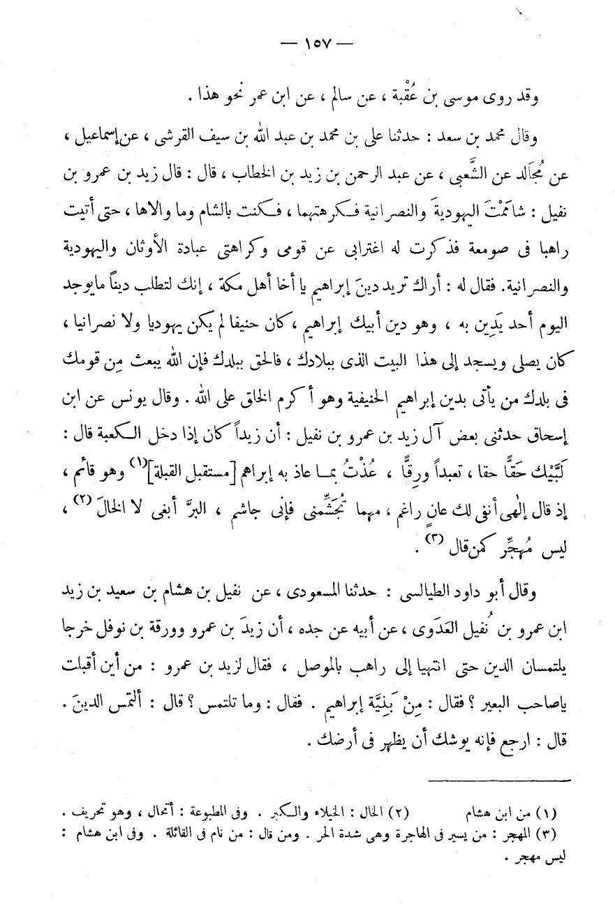 وَقَالَ أَبُو دَاوُدَ الطَّيَالِسِيُّ: حَدَّثَنَا الْمَسْعُودِيُّ، عَنْ نُفَيْلِ بْنِ هِشَامِ بْنِ سَعِيدِ بْنِ زَيْدِ ابْن عَمْرِو بْنِ نُفَيْلٍ الْعَدَوِيِّ، عَنْ أَبِيهِ عَنْ جَدِّهِ، أَنَّ زَيْدَ بْنَ عَمْرٍو وَوَرَقَةَ بْنَ نَوْفَلٍ خَرَجًا يَلْتَمِسَانِ الدِّينَ حَتَّى انْتَهَيَا إِلَى رَاهِبٍ بِالْمَوْصِلِ، فَقَالَ لِزَيْدِ بْنِ عَمْرٍو: مِنْ أَيْنَ أَقْبَلْتَ يَا صَاحِبَ الْبَعِيرِ؟ فَقَالَ: مِنْ بَنِيَّةِ إِبْرَاهِيمَ.