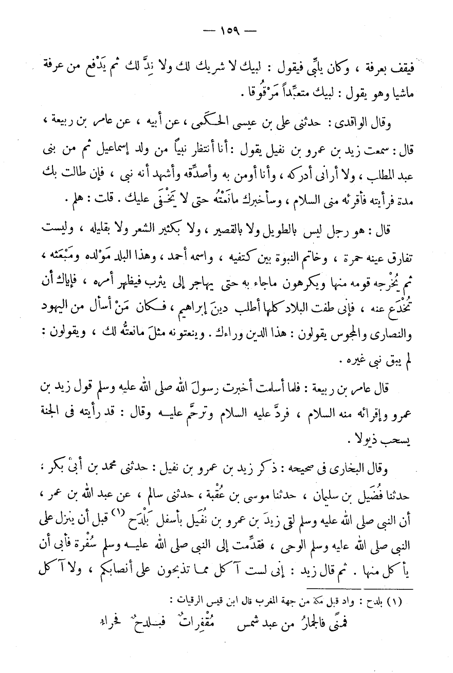 وَقَالَ الْبُخَارِيُّ فِي صَحِيحِهِ: ذِكْرُ زَيْدِ بْنِ عَمْرو بن نفَيْل: حَدَّثَنى مُحَمَّدُ بْنُ أَبِي بَكْرٍ، حَدَّثَنَا فُضَيْلُ بْنُ سُلَيْمَانَ، حَدَّثَنَا مُوسَى بْنُ عُقْبَةَ، حَدَّثَنِي سَالِمٌ، عَنْ عَبْدِ اللَّهِ بْنِ عُمَرَ، أَنَّ النَّبِيَّ صَلَّى اللَّهُ عَلَيْهِ وَسَلَّمَ لَقِيَ زَيْدَ بْنَ عَمْرِو بْنِ نُفَيْلٍ بِأَسْفَلِ بَلْدَحَ (1) قَبْلَ أَنْ يَنْزِلَ عَلَى النَّبِيِّ صَلَّى اللَّهُ عَلَيْهِ وَسَلَّمَ الْوَحْيُ، فَقُدِّمَتْ إِلَى النَّبِيِّ صَلَّى اللَّهُ عَلَيْهِ وَسَلَّمَ سُفْرَةٌ فَأَبَى أَنْ