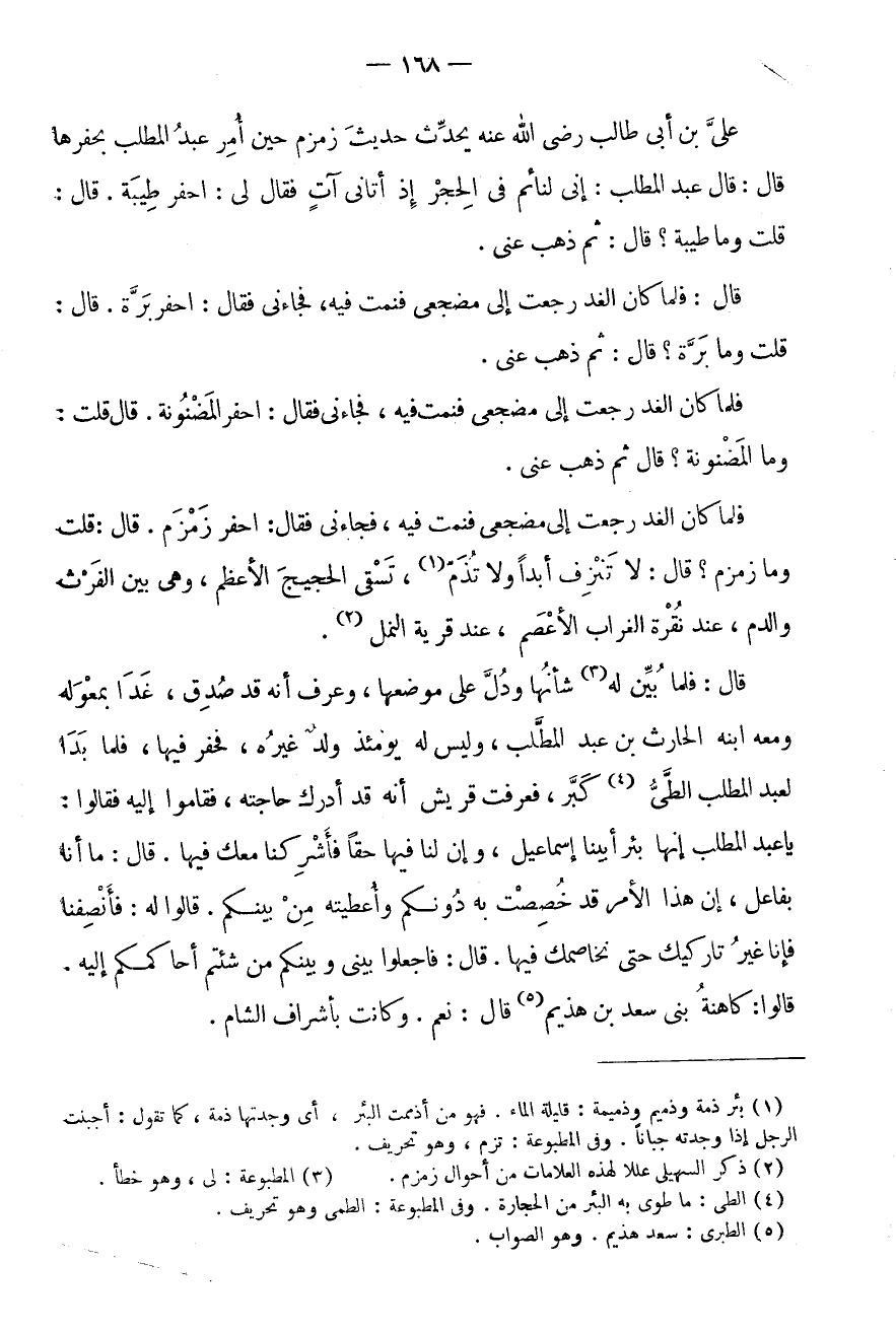 عَلِيِّ بْنِ أَبِي طَالِبٍ رَضِيَ اللَّهُ عَنْهُ يُحَدِّثُ حَدِيثَ زَمْزَمَ حِينَ أُمِرَ عَبْدُ الْمُطَّلِبِ بِحَفْرِهَا قَالَ: قَالَ عَبْدُ الْمُطَّلِبِ: إِنِّي لَنَائِمٌ فِي الْحِجْرِ إِذْ أَتَانِي آتٍ فَقَالَ لِي: احْفِرْ طِيبَةَ.
