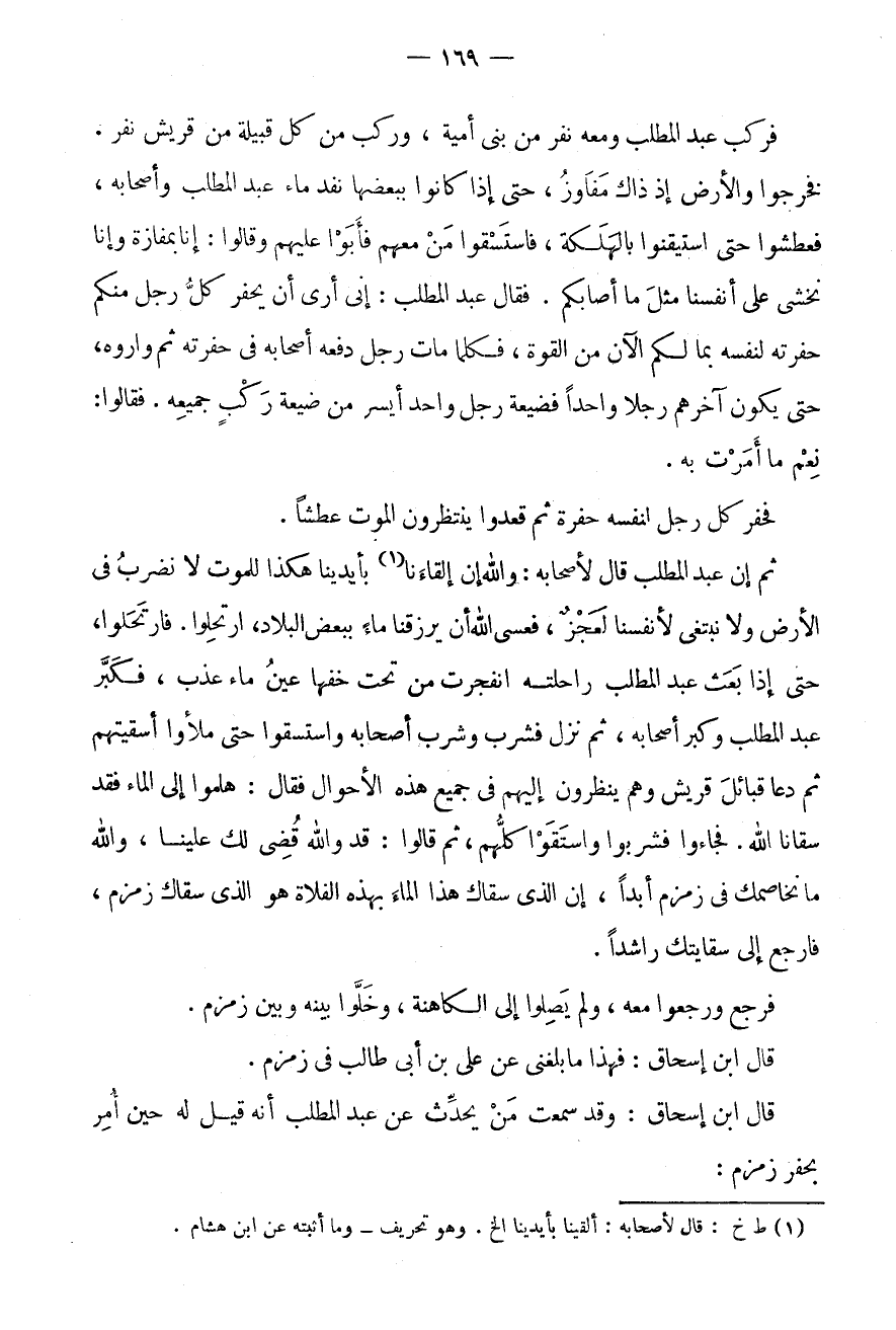 ثمَّ إِن عبد الْمطلب قَالَ لاصحابه: وَالله إِنَّ إِلْقَاءَنَا (1) بِأَيْدِينَا هَكَذَا لِلْمَوْتِ لَا نَضْرِبُ فِي الارض وَلَا نبتغى لانفسنا لعجز، فَعَسَى الله أَن يرزقنا مَاء بِبَعْض الْبِلَاد، ارتحلوا.