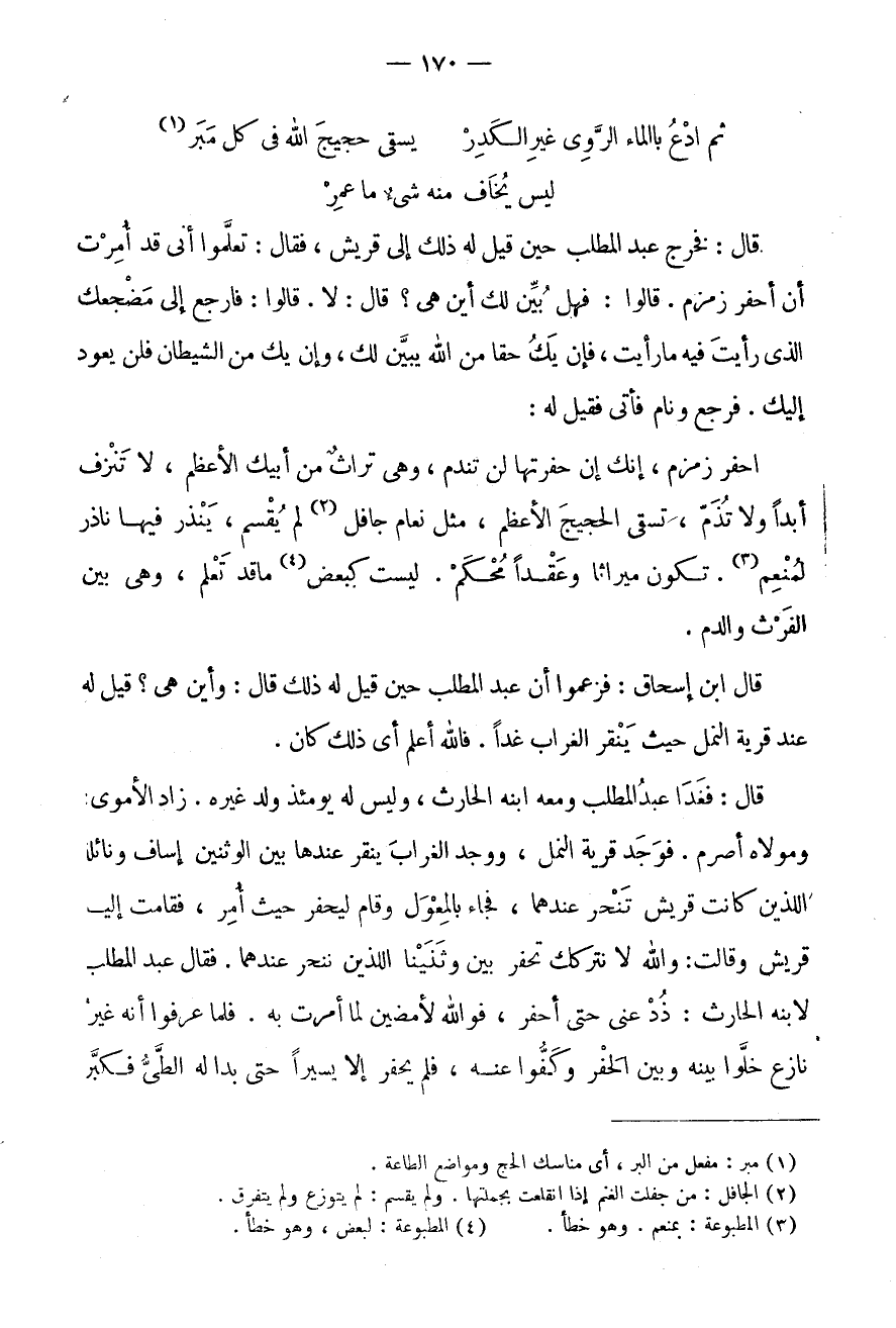 ثمَّ ادْع باالماء الرِّوَى غَيْرِ الْكَدِرْ * يَسْقِي حَجِيجَ اللَّهِ فِي كل مبر (1) لَيْسَ يخَاف مِنْهُ شئ مَا عَمَرْ قَالَ: فَخَرَجَ عَبْدُ الْمُطَّلِبِ حِينَ قِيلَ لَهُ ذَلِكَ إِلَى قُرَيْشٍ، فَقَالَ: تَعْلَمُوا أَنِّي قَدْ أُمِرْتُ أَنْ أَحْفِرَ زَمْزَمَ.