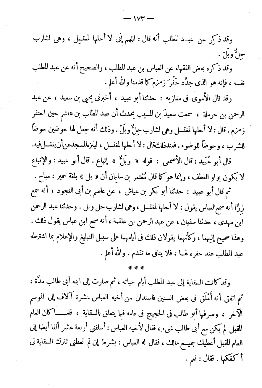 ثُمَّ قَالَ أَبُو عُبَيْدٍ: حَدَّثَنَا أَبُو بَكْرِ بْنِ عَيَّاشٍ، عَنْ عَاصِمِ بْنِ أَبِي النجُود، أَنه سمع زرا أَنَّهُ سَمِعَ الْعَبَّاسَ يَقُولُ: لَا أُحِلُّهَا لِمُغْتَسِلٍ، وَهِيَ لِشَارِبٍ حِلٌّ وَبِلٌّ.
