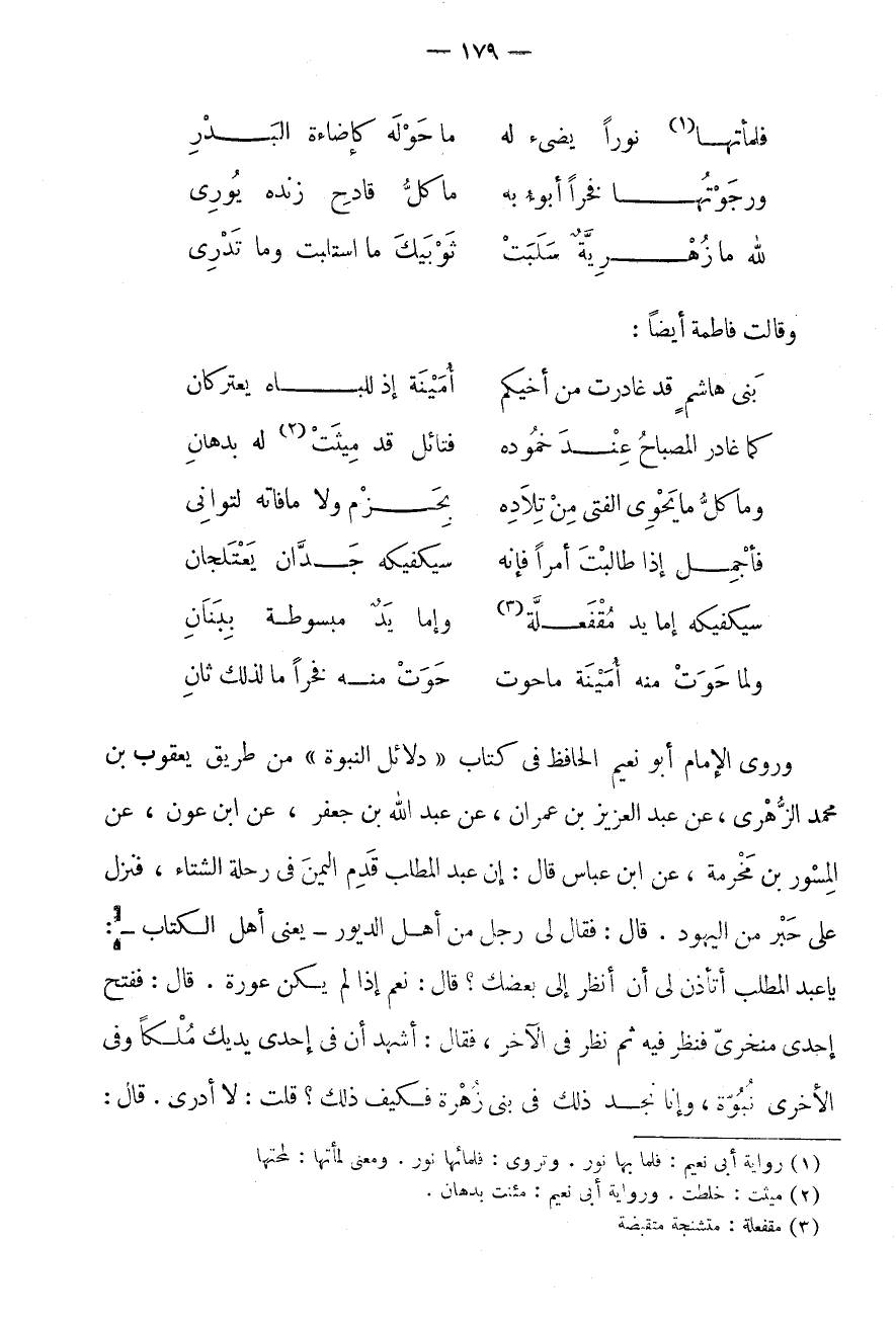 فلمأتها (1) نورا يضئ لَهُ * مَا حَوْلَهُ كَإِضَاءَةِ الْبَدْرِ وَرَجَوْتُهَا فَخْرًا أَبُوءُ بِهِ * مَا كُلُّ قَادِحِ زَنْدِهِ يُورِي لَلَّهِ مَا زُهْرِيَّةٌ سَلَبَتْ * ثَوْبَيْكَ مَا اسْتَلَبَتْ وَمَا تَدْرِي وَقَالَتْ فَاطِمَةُ أَيْضًا: بَنِي هَاشِمٍ قَدْ غَادَرَتْ مِنْ أَخِيكُمْ * أَمِينَةُ إِذْ لِلْبَاهِ يَعْتَرِكَانِ كَمَا غَادَرَ الْمِصْبَاحَ عِنْدَ خُمُودِهِ * فَتَائِلُ قَدْ مِيثَتْ (2) لَهُ بِدِهَانِ وَمَا كُلُّ مَا يَحْوِي الْفَتَى مِنْ تِلَادِهِ * بَحَزْمٍ وَلَا مَا فَاتَهُ لِتَوَانِي فَأَجْمِلْ إِذَا طَالَبْتَ أَمْرًا فَإِنَّهُ * سَيَكْفِيكَهُ جِدَّانِ يَعْتَلِجَانِ سَيَكْفِيكَهُ إِمَّا يِدٌ مُقْفَعِلَّةٌ (3) * وَإِمَّا يَدٌ مَبْسُوطَةٌ بِبَنَانِ وَلَمَّا حَوَتْ مِنْهُ أَمِينَةُ مَا حَوَتْ * حَوَتْ مِنْهُ فَخْرًا مَا لذَلِك ثَان وروى الامام أَبُو نُعَيْمٍ الْحَافِظُ فِي كِتَابِ " دَلَائِلِ النُّبُوَّةِ " مِنْ طَرِيقِ يَعْقُوبَ بْنِ مُحَمَّدٍ الزُّهْرِيِّ، عَنْ عَبْدِ الْعَزِيزِ بْنِ عِمْرَانَ، عَنْ عَبْدِ اللَّهِ بْنِ جَعْفَرٍ، عَنِ ابْنِ عَوْنٍ، عَنِ الْمِسْوَرِ بْنِ مَخْرَمَةَ، عَنِ ابْنِ عَبَّاس قَالَ: إِن عبد الملب قَدِمَ الْيَمَنَ فِي رِحْلَةِ الشِّتَاءِ، فَنَزَلَ عَلَى حَبْرٍ مِنَ الْيَهُودِ.