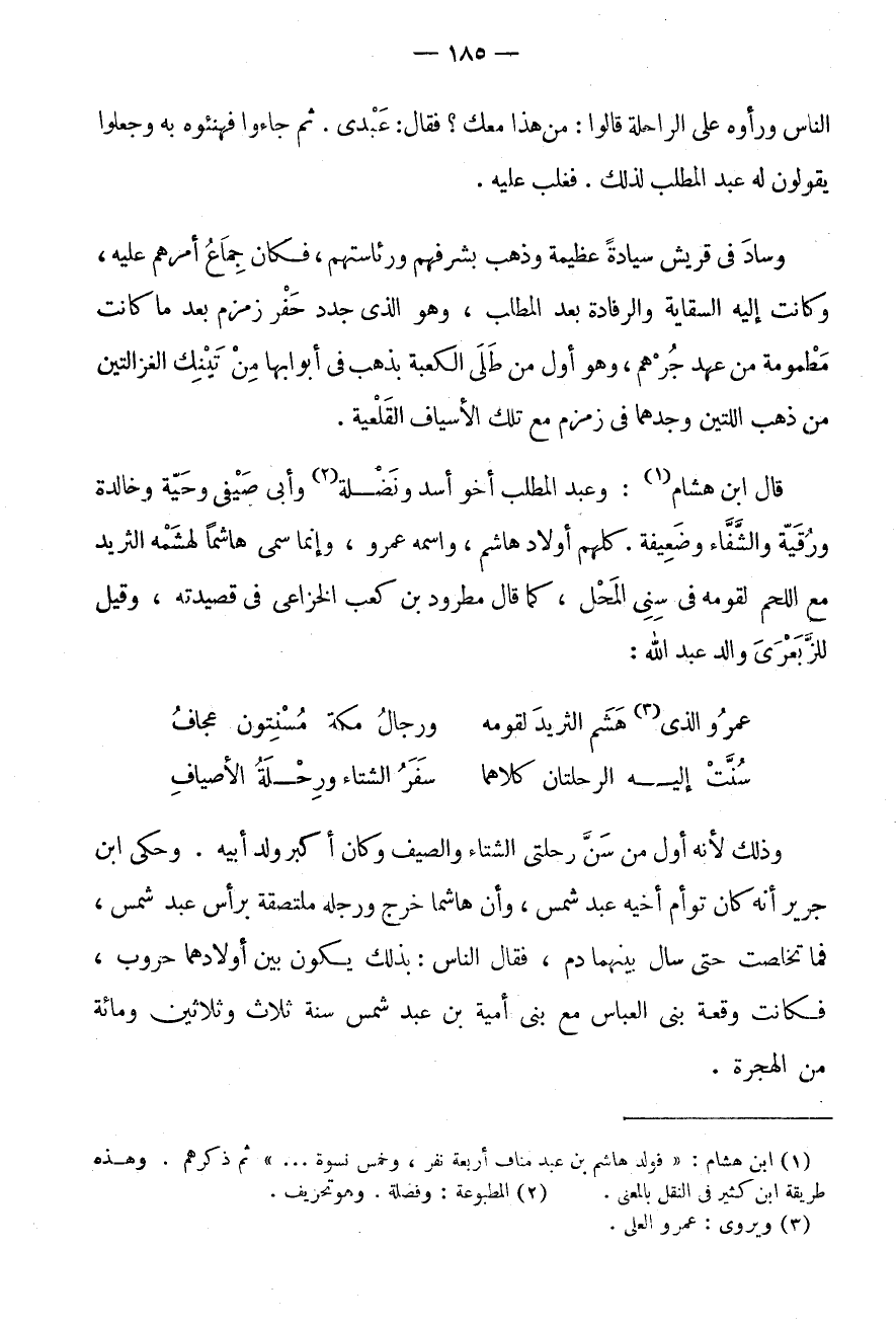 كُلُّهُمْ أَوْلَادُ هَاشِمٍ، وَاسْمُهُ عَمْرٌو، وَإِنَّمَا سُمِّيَ هَاشِمًا لَهَشْمِهِ الثَّرِيدَ مَعَ اللَّحْمِ لِقَوْمِهِ فِي سِنِي الْمَحْلِ، كَمَا قَالَ مَطْرُودُ بْنُ كَعْب الخزاعى فِي قصيدته، وَقيل للزبعرى وَالِد عبد الله: عَمْرو الذى (3) هَشَمَ الثَّرِيدَ لِقَوْمِهِ * وَرِجَالُ مَكَّةَ مُسْنِتُونَ عِجَافُ سُنَّتْ إِلَيْهِ الرِّحْلَتَانِ كِلَاهُمَا * سَفَرُ الشِّتَاءِ وَرِحْلَةُ الْأَصْيَافِ وَذَلِكَ لِأَنَّهُ أَوَّلُ مَنْ سَنَّ رِحْلَتَيِ الشِّتَاءِ وَالصَّيْفِ وَكَانَ أَكْبَرَ وَلَدِ أَبِيهِ.